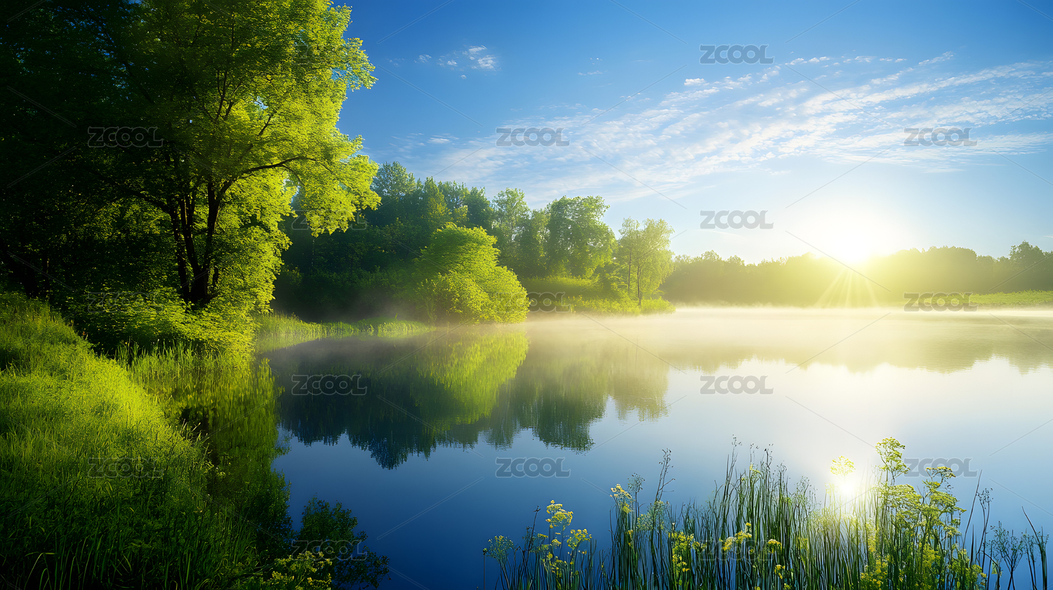 湖面,晨雾,树林,倒影,清晨,雾气,水面,反射,树影,宁静