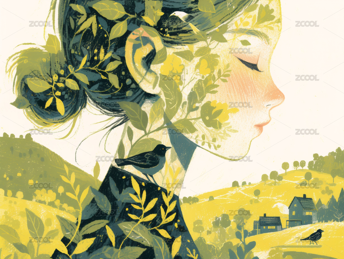 春天和少女头像的插画