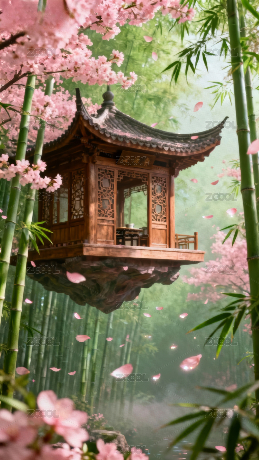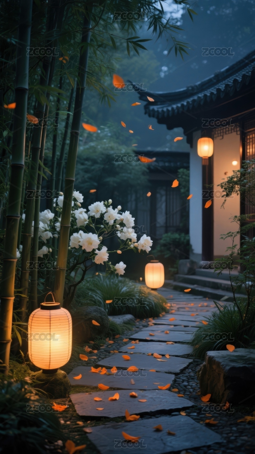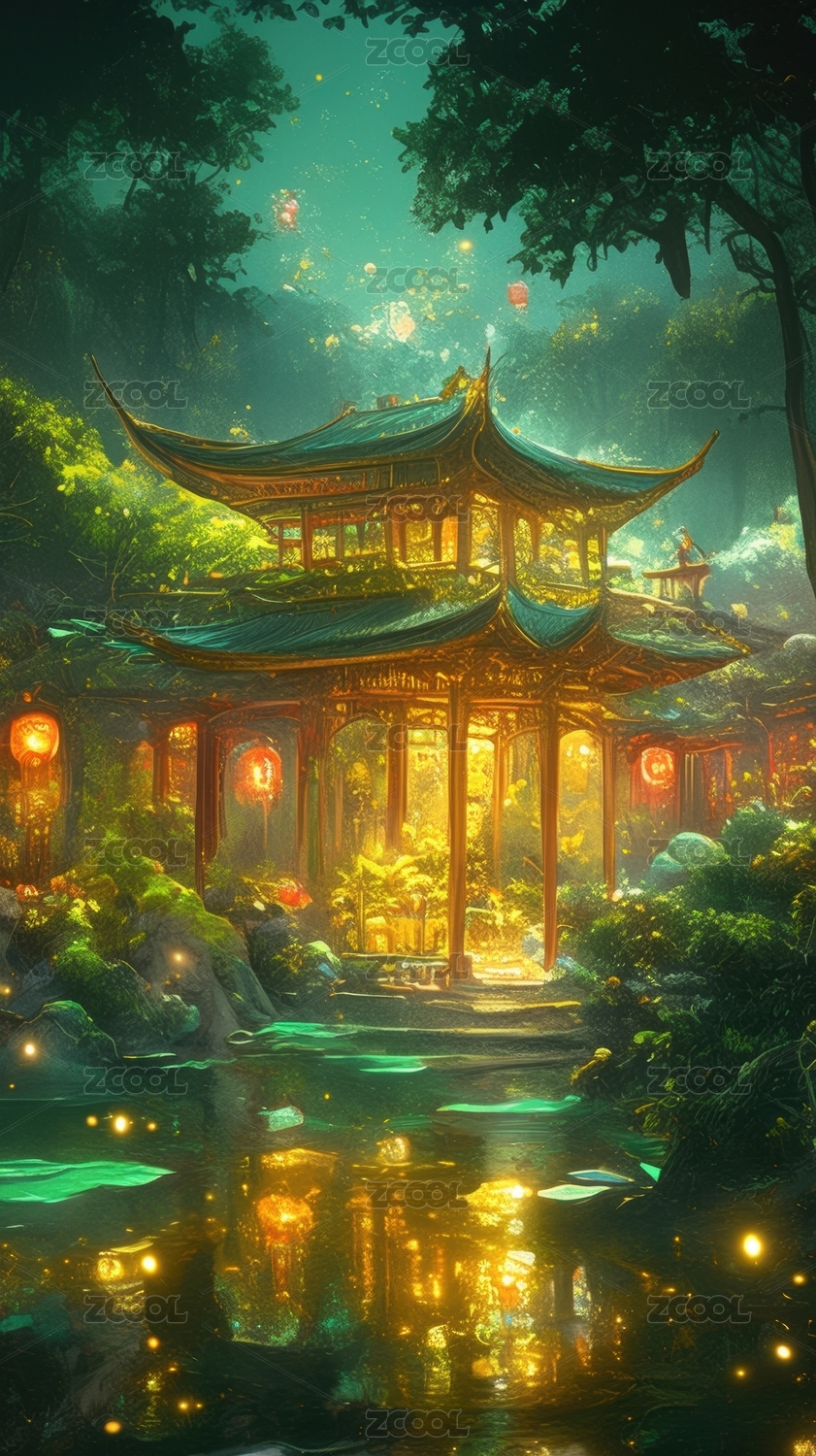 山水,建筑,庭院,树木,池塘,自然,宁静,风景,景色,红灯笼