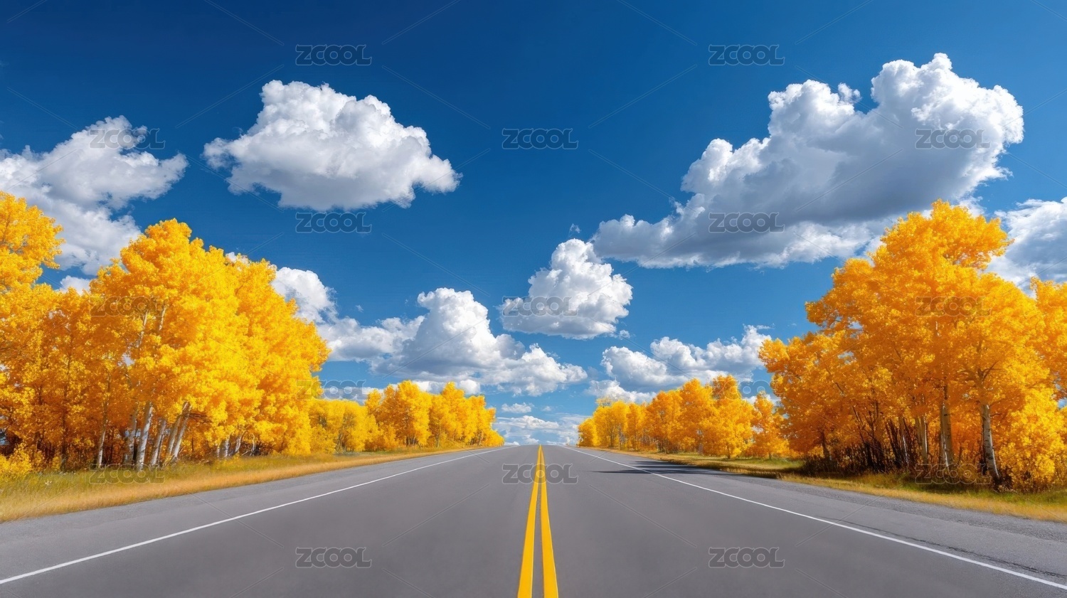 秋日公路两旁金黄树木
