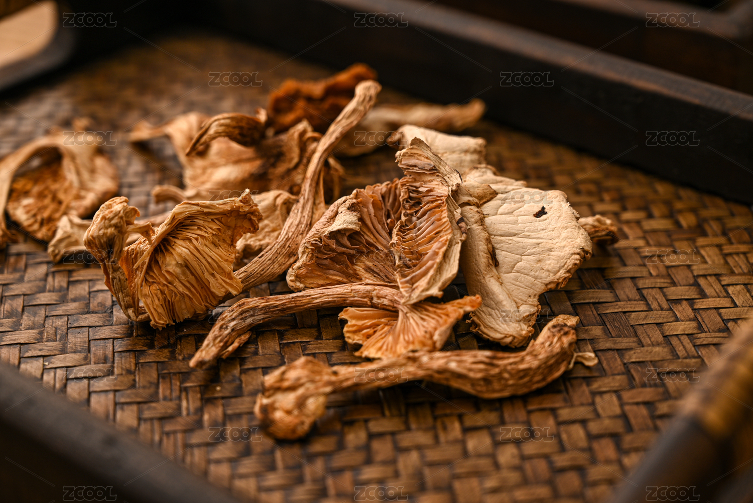 木纹背景上摆放的晒干茶树菇