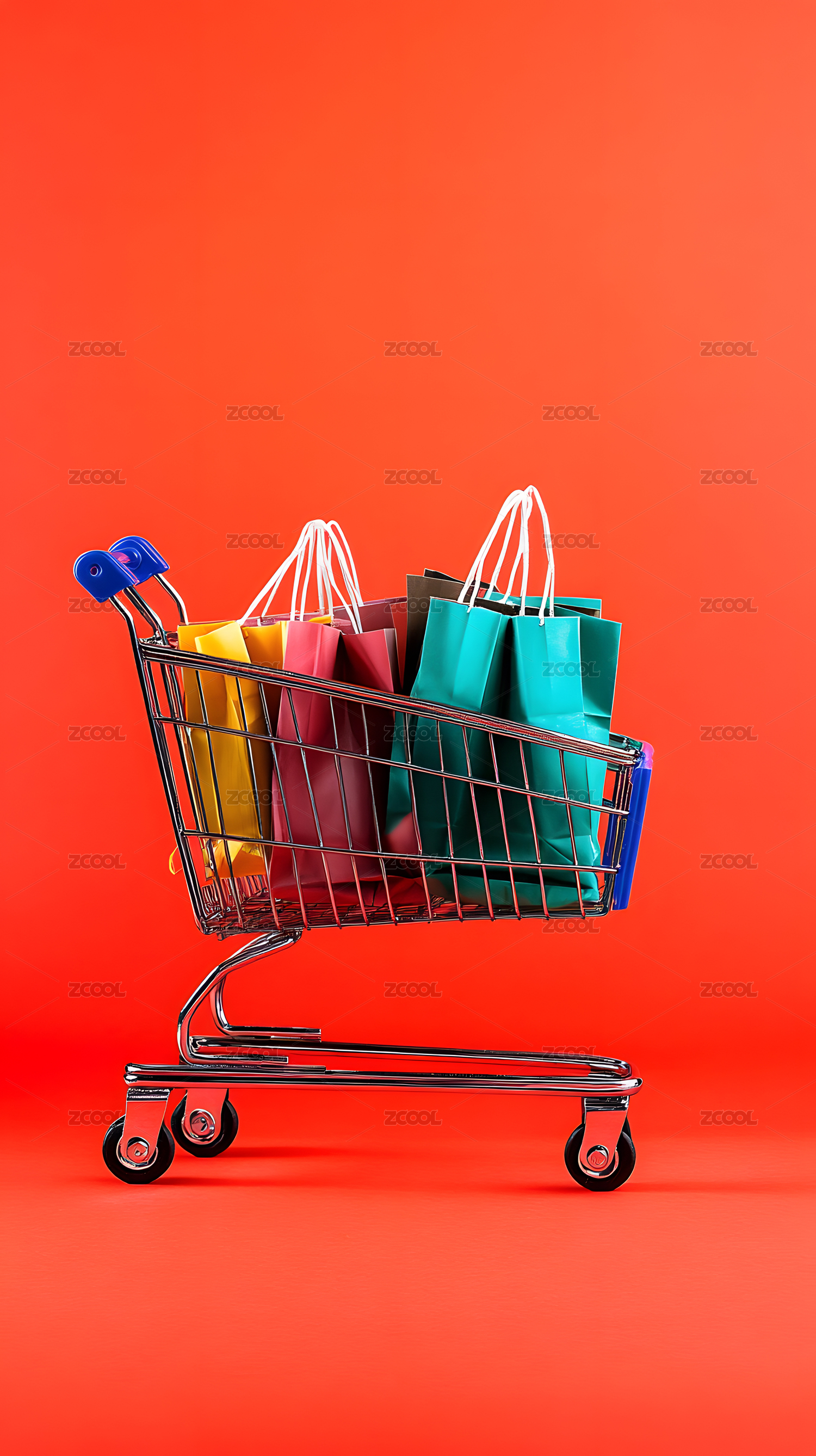 红色背景购物小车彩色购物袋