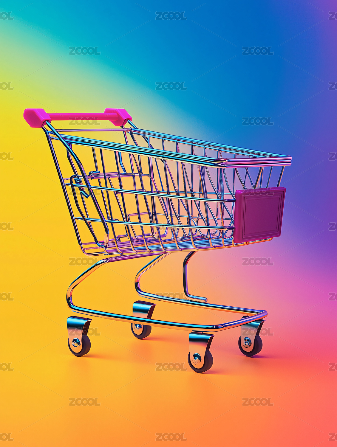 红黄蓝背景前的购物车模型概念