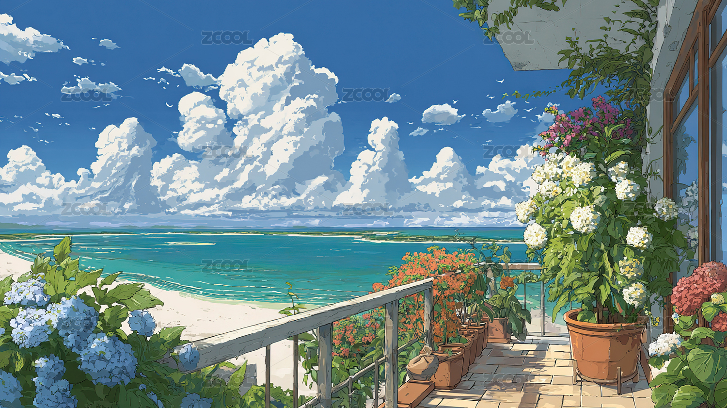 拱门,玫瑰,庄园,海边,阳光,蓝天,白云,泡泡,柱子,花朵