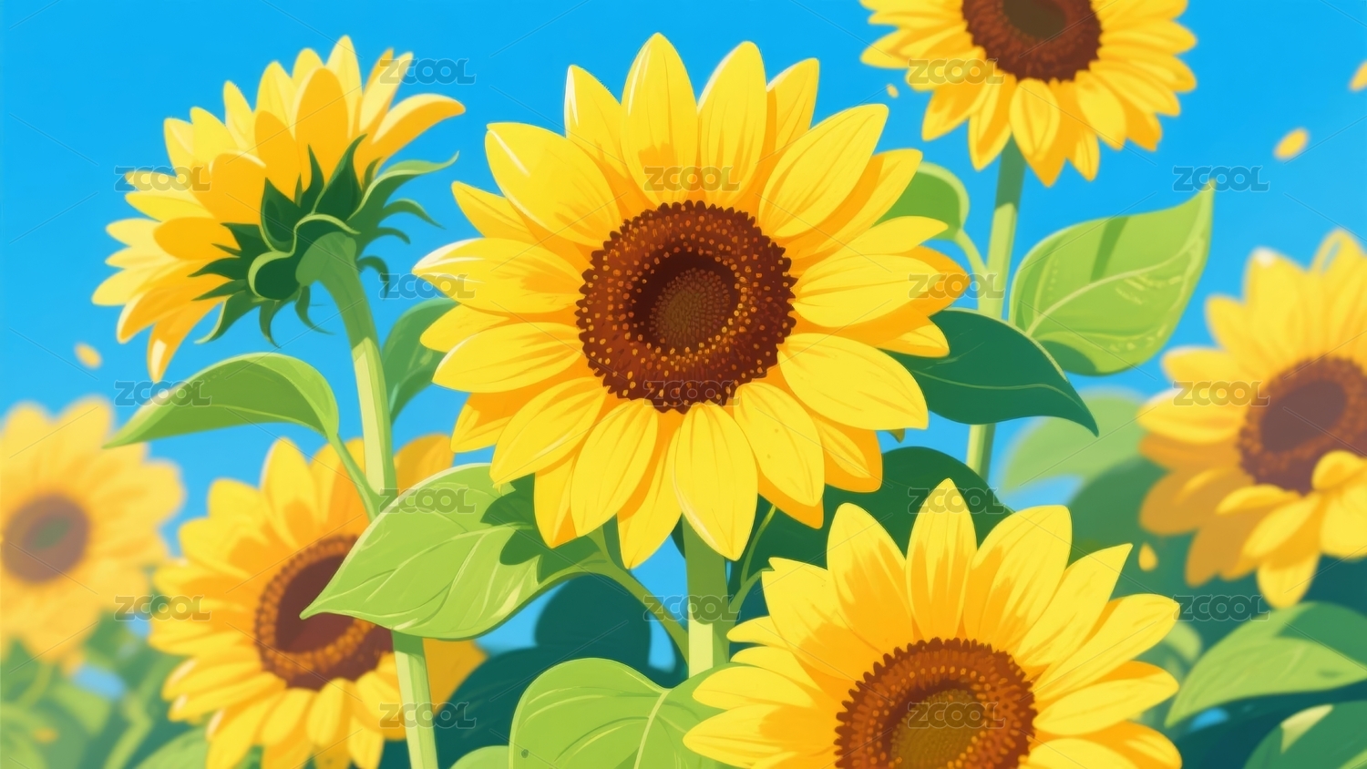 阳光, 白云, 蓝天, 自然, 田野, 风景, 清新, 水彩, 插画, 植物