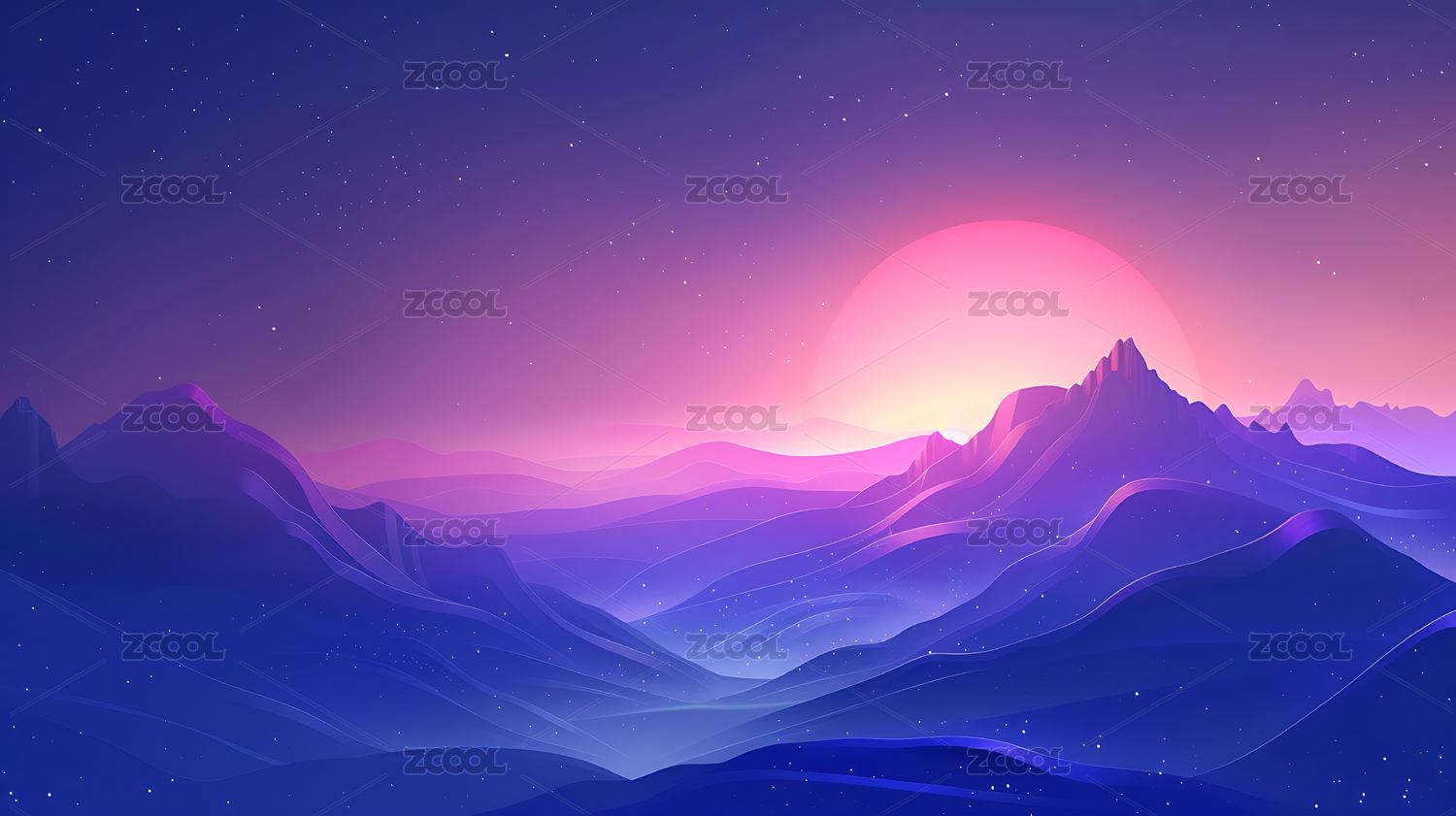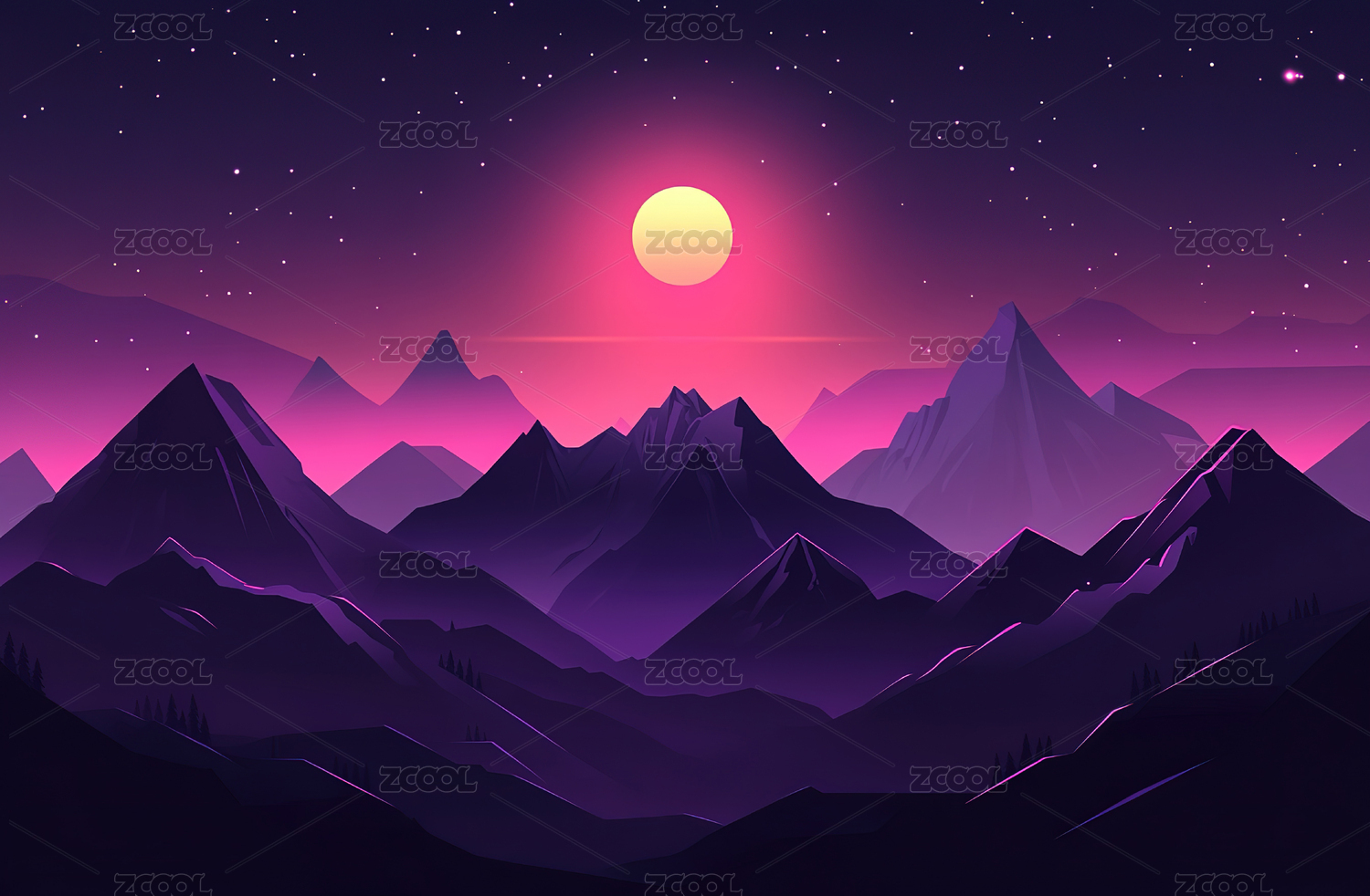 平面插画月光下的紫色山脉背景