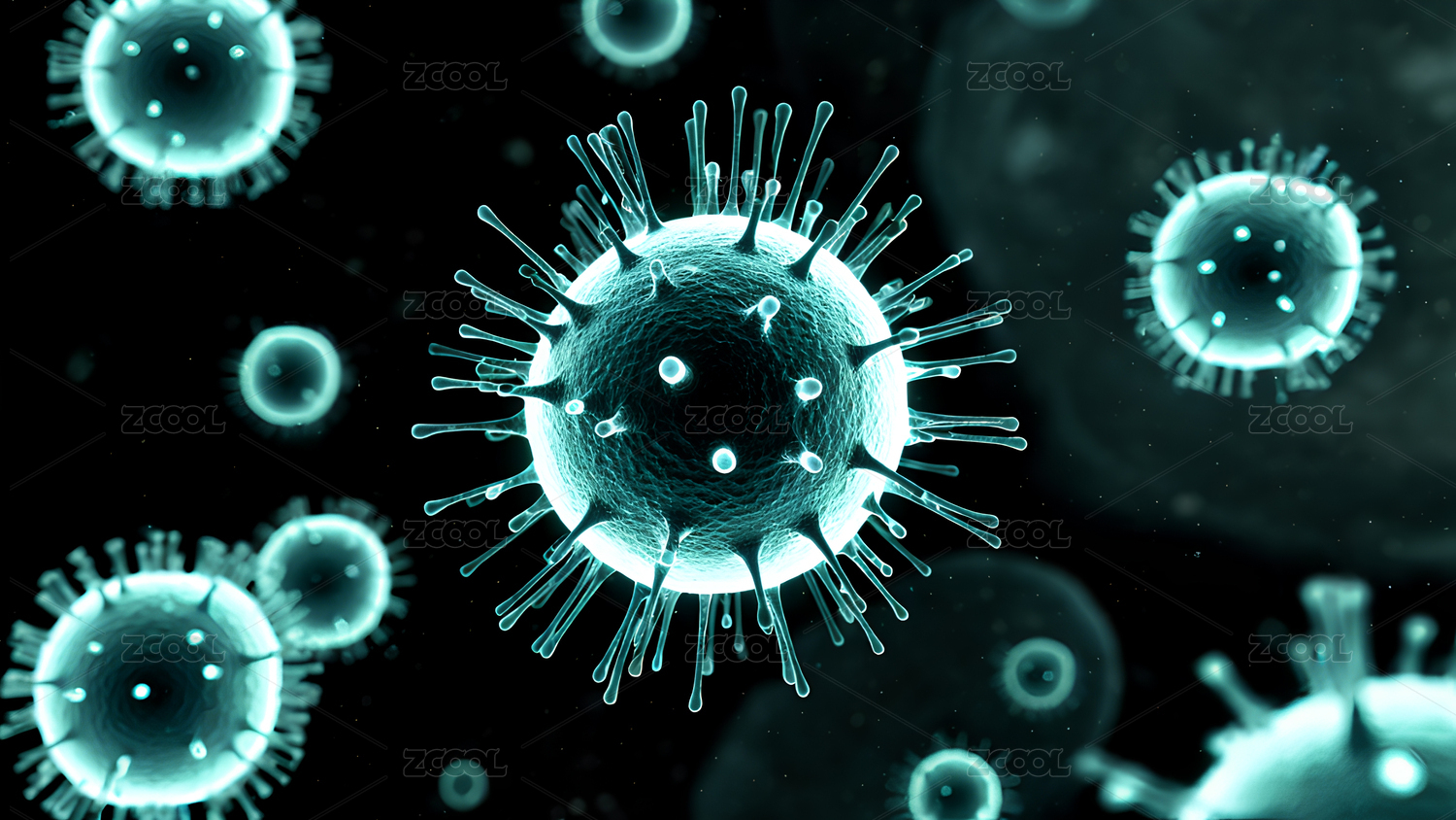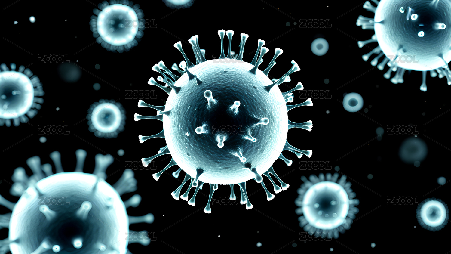 画面中呈现出带有突起结构的病毒颗粒