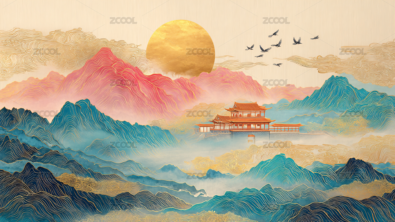 鎏金山水楼阁国潮创意艺术装饰背景图