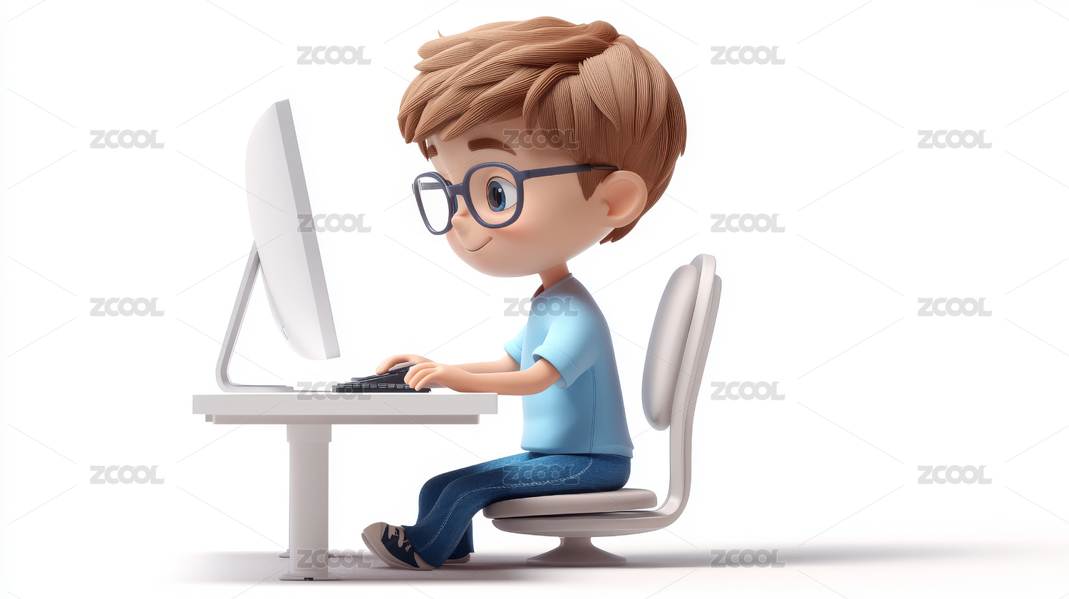 3D卡通风格坐在桌前微笑使用电脑的儿童