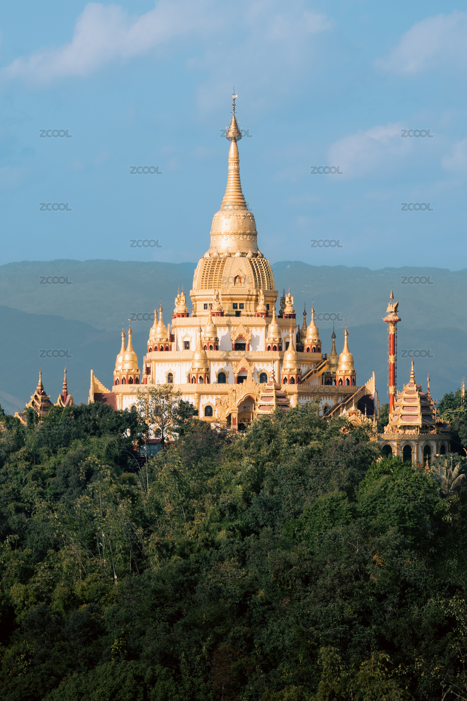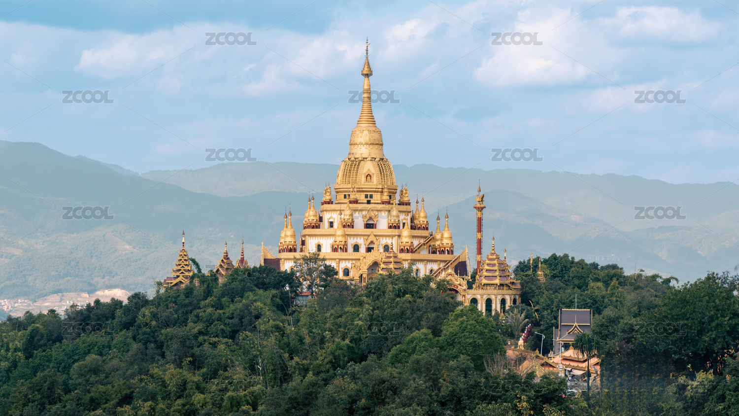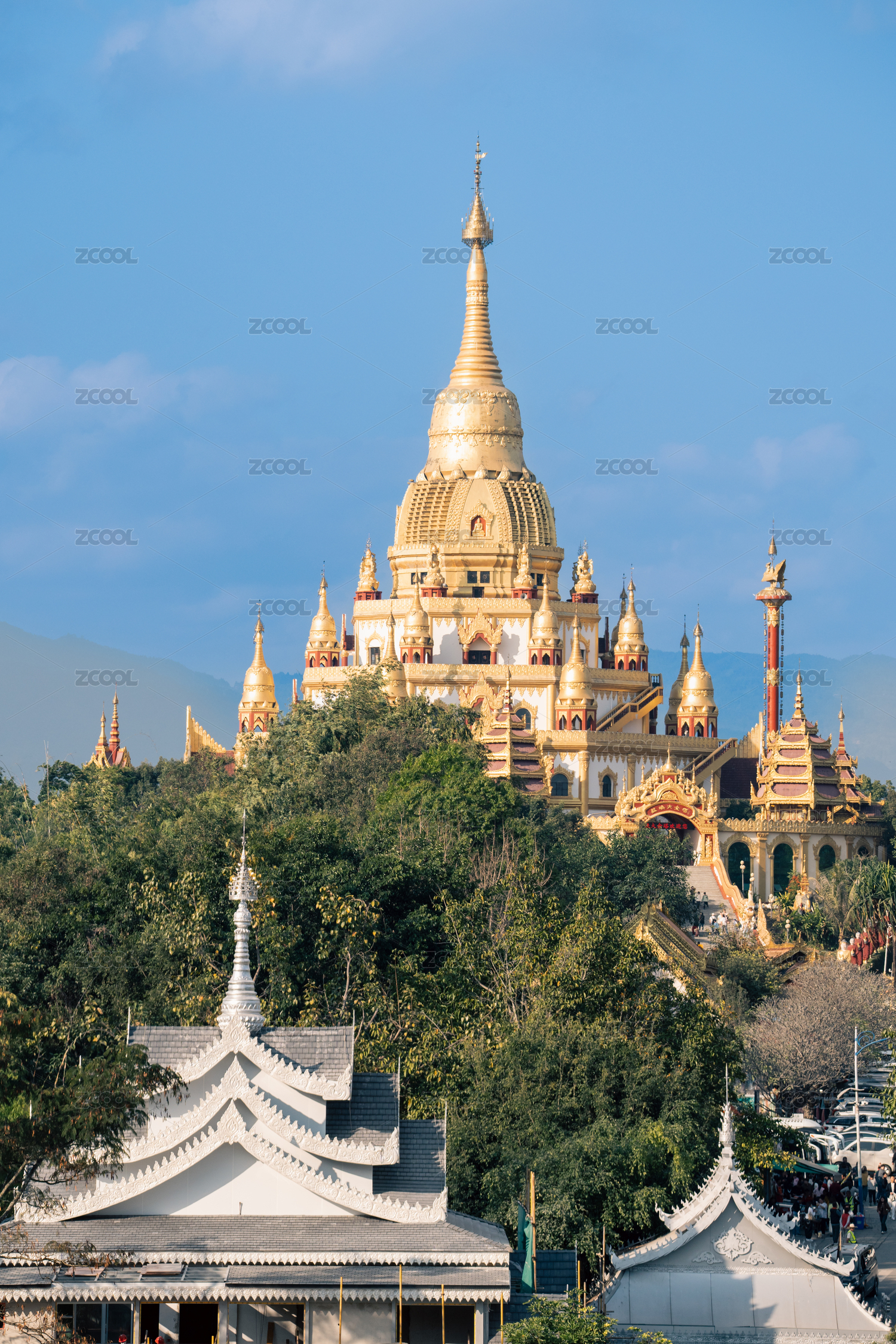 白天,远处山上金色的塔、寺庙