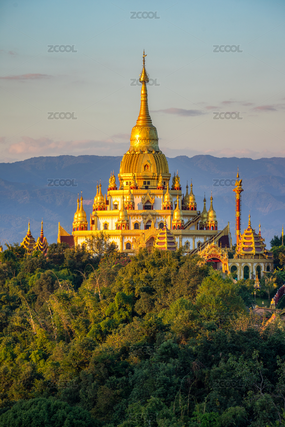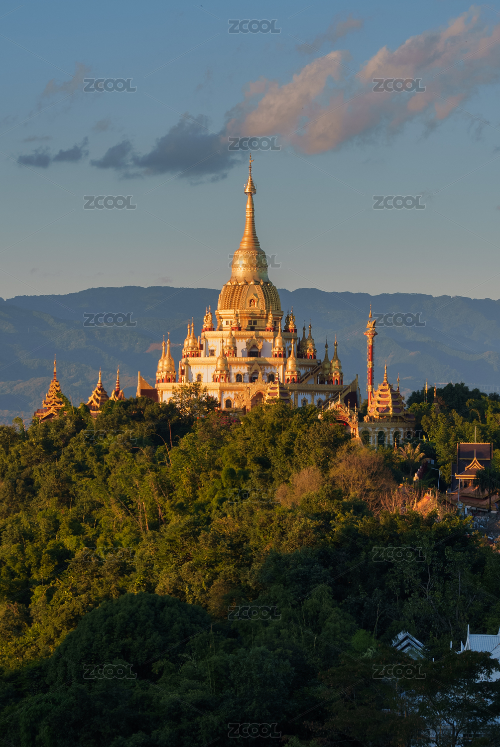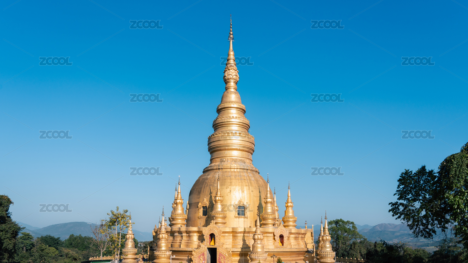 白天,远处山上金色的塔、寺庙