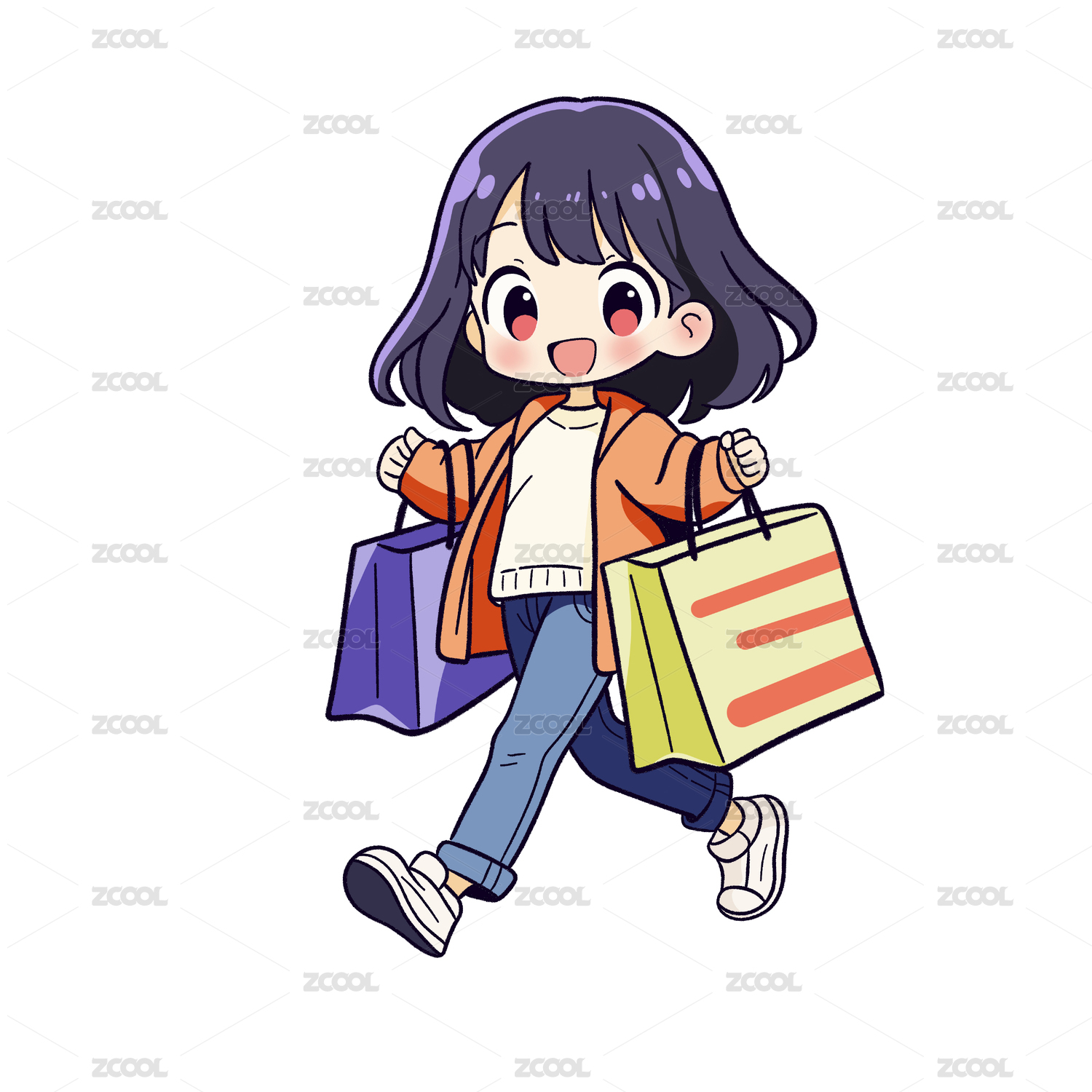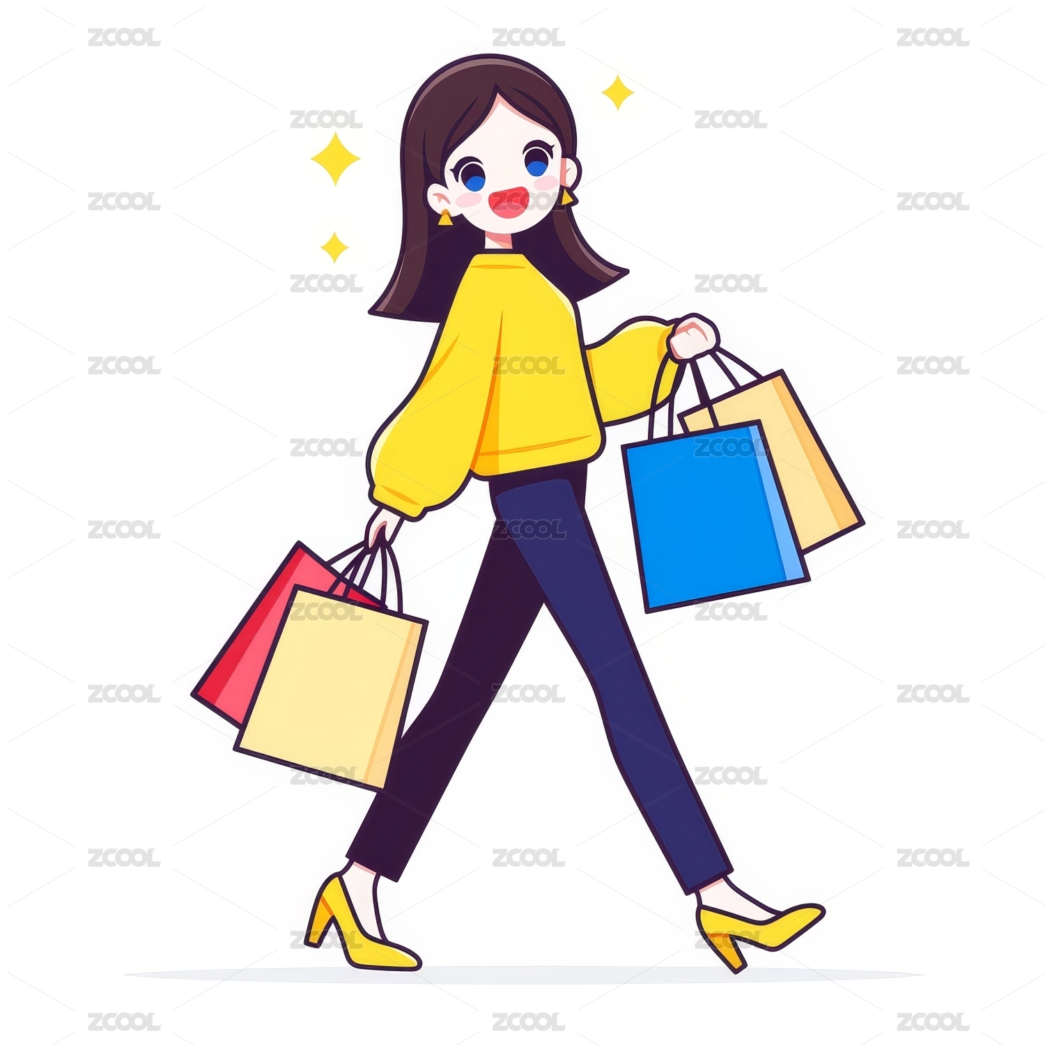 购物逛街的女孩时尚买手卡通简笔画贴纸