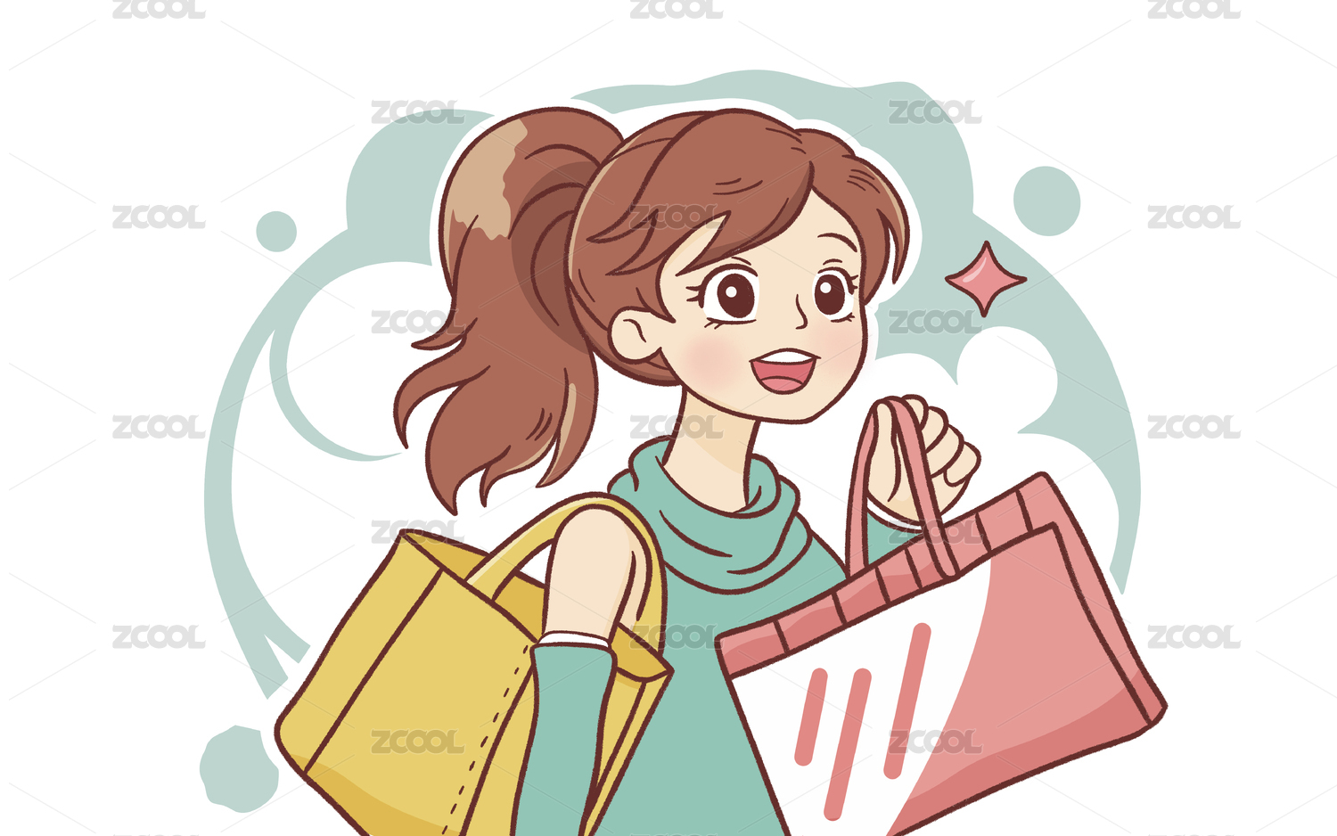 购物狂女孩手提购物袋星星眼手绘卡通插画