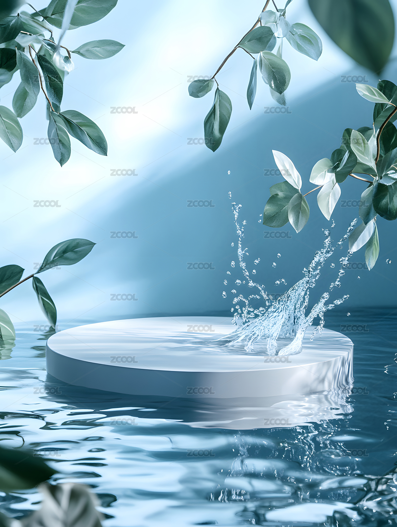 水花,绿叶,水滴,蓝色背景,创意摄影