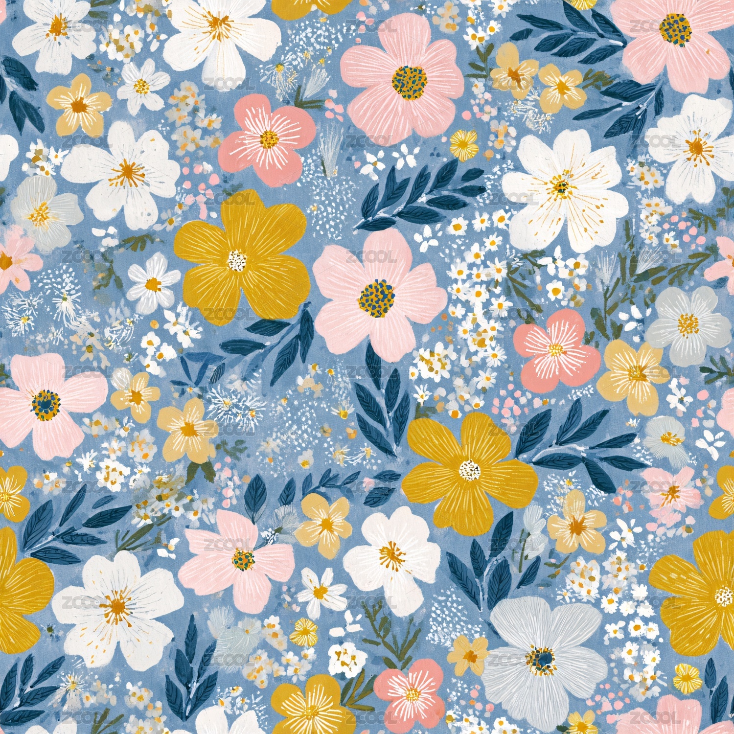 蓝底粉白花卉装饰图案