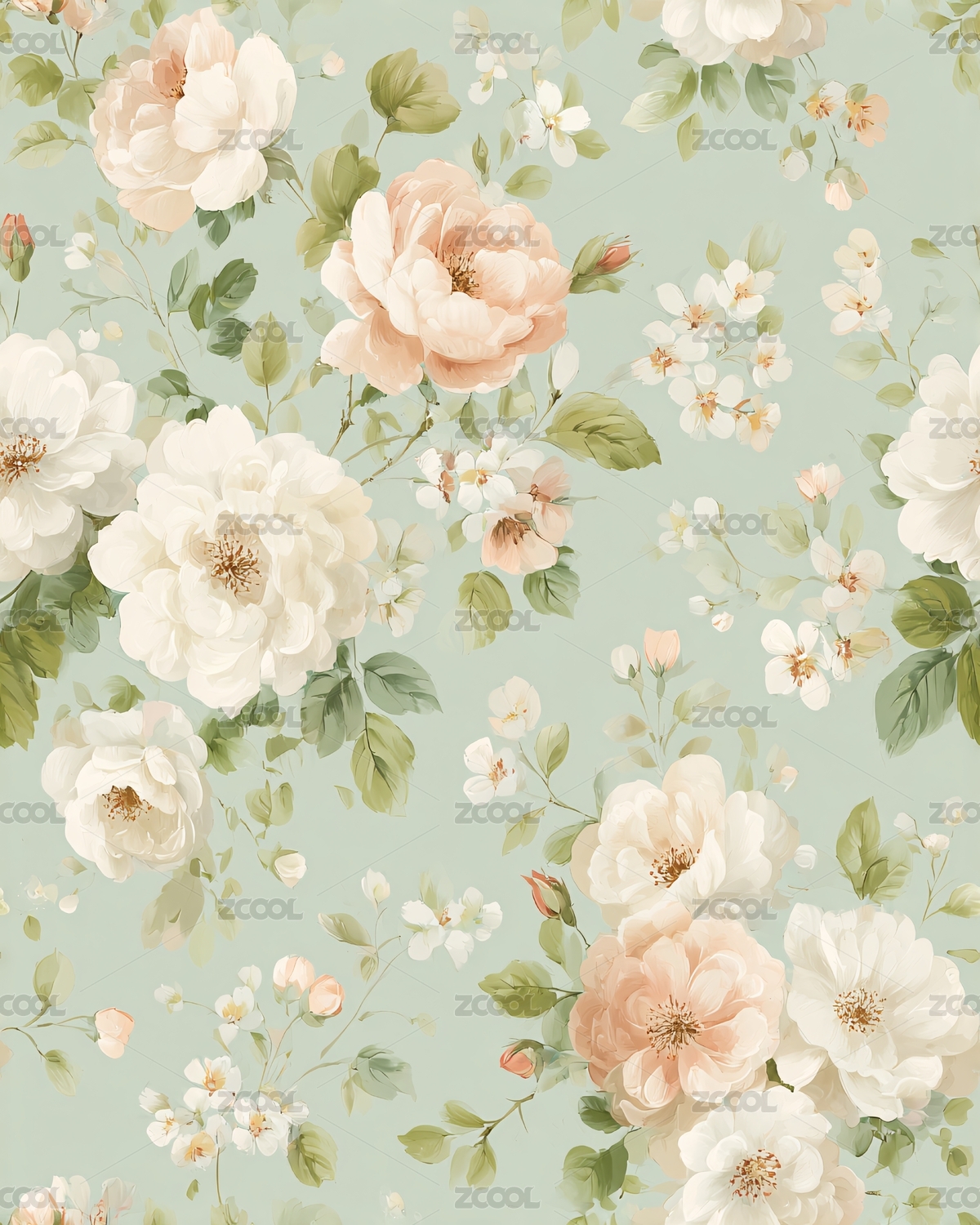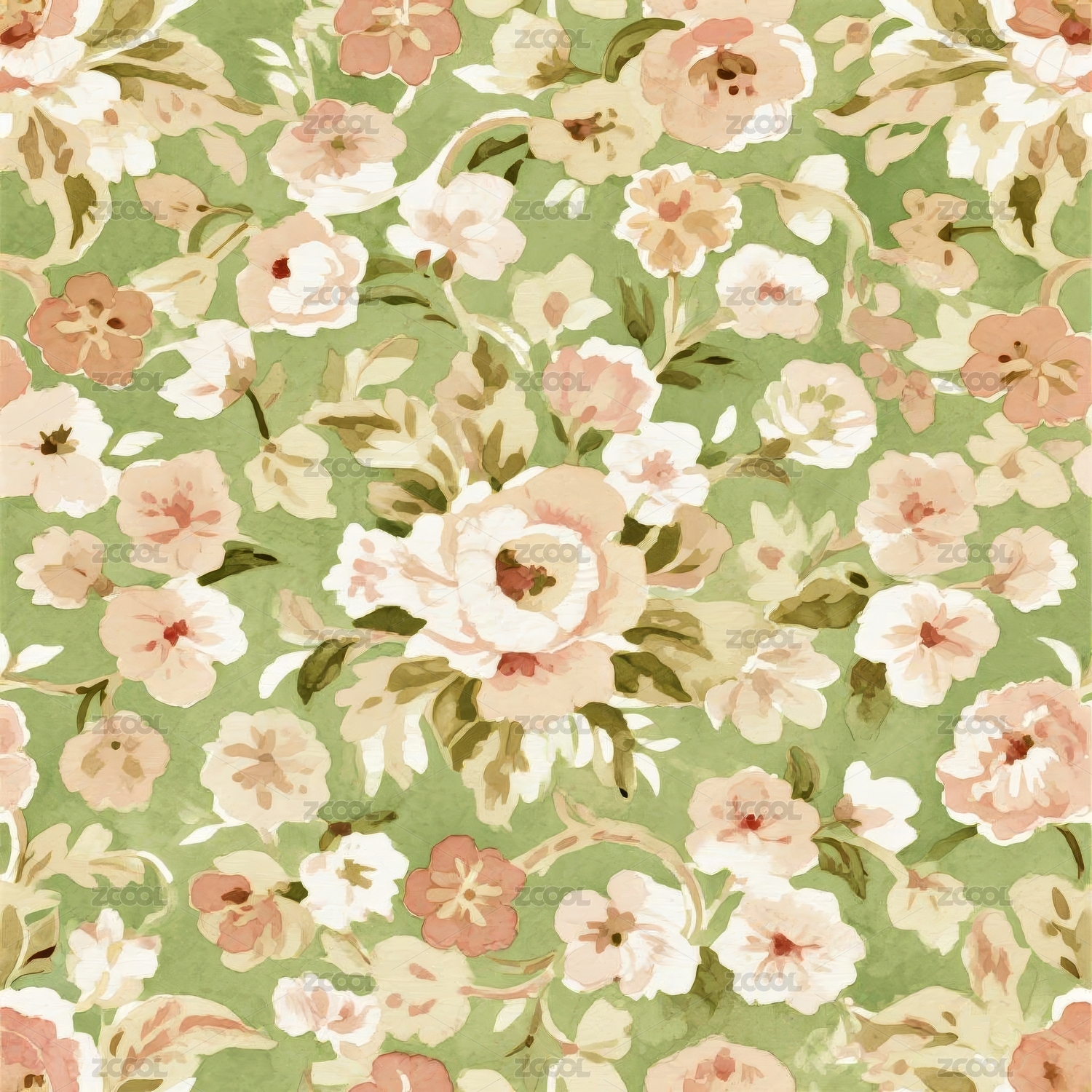 绿底白玫枝叶花卉图案
