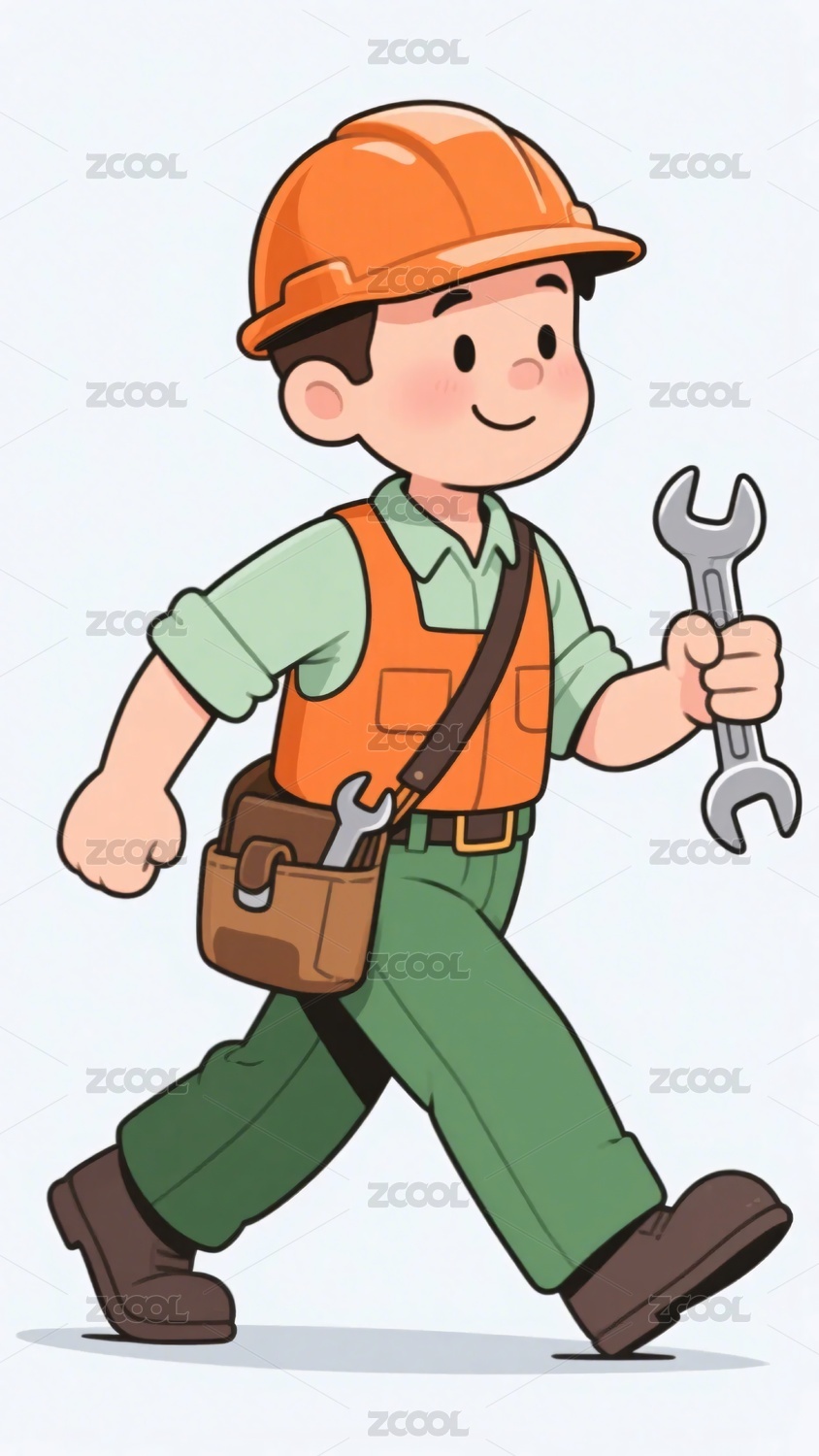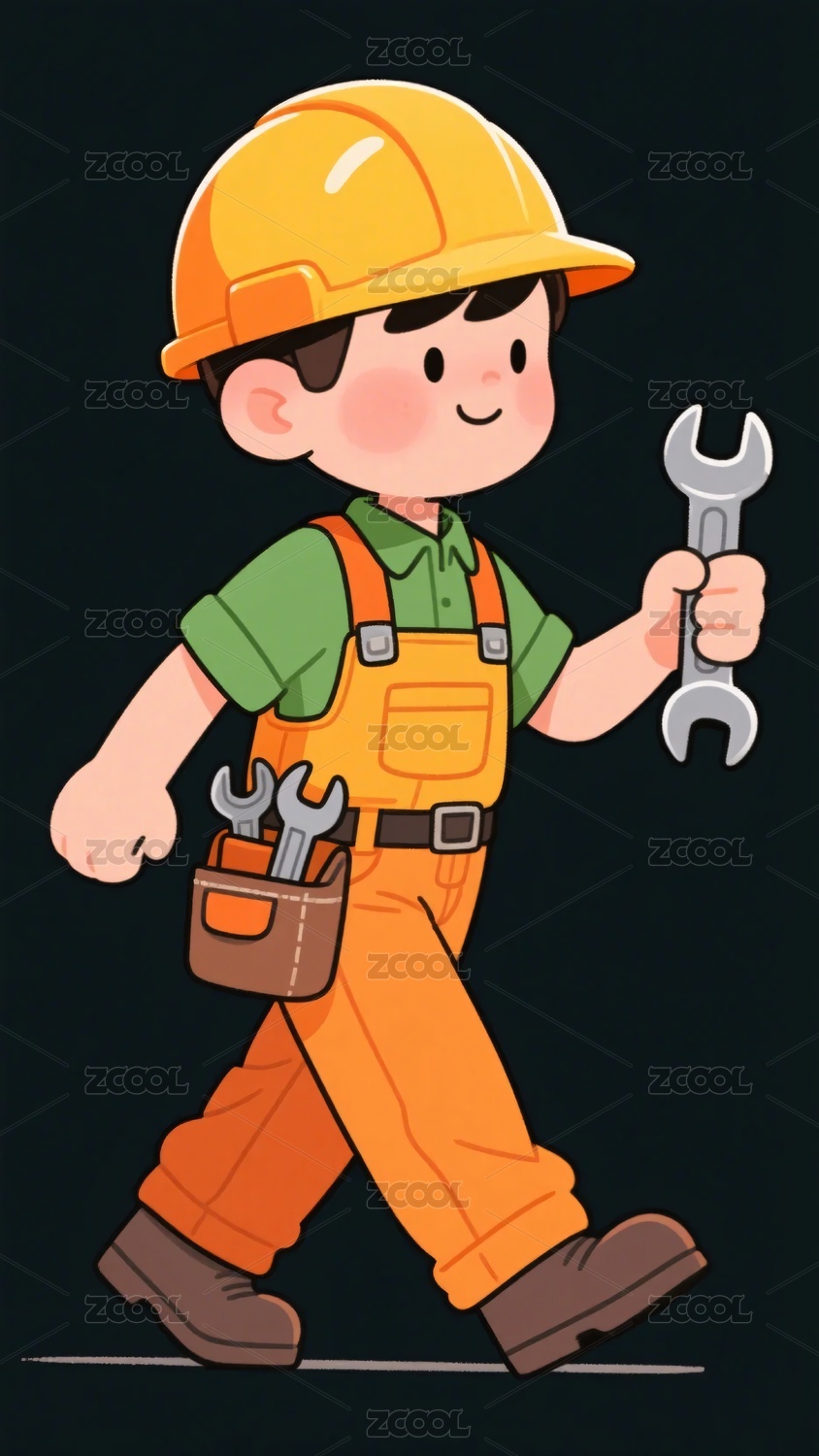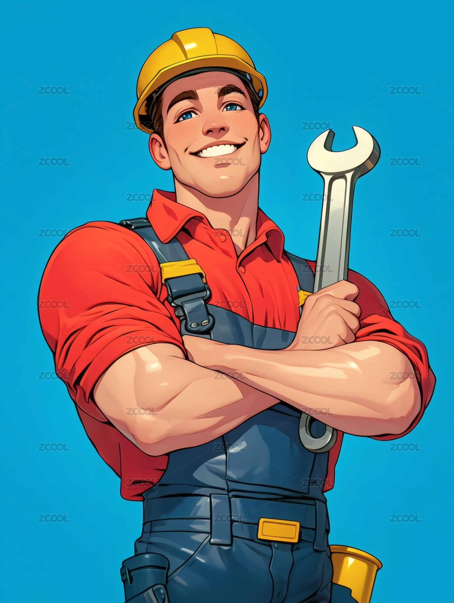 工人,黄帽,手套,扳手,工具,微笑,腰带,口袋,零件,机械