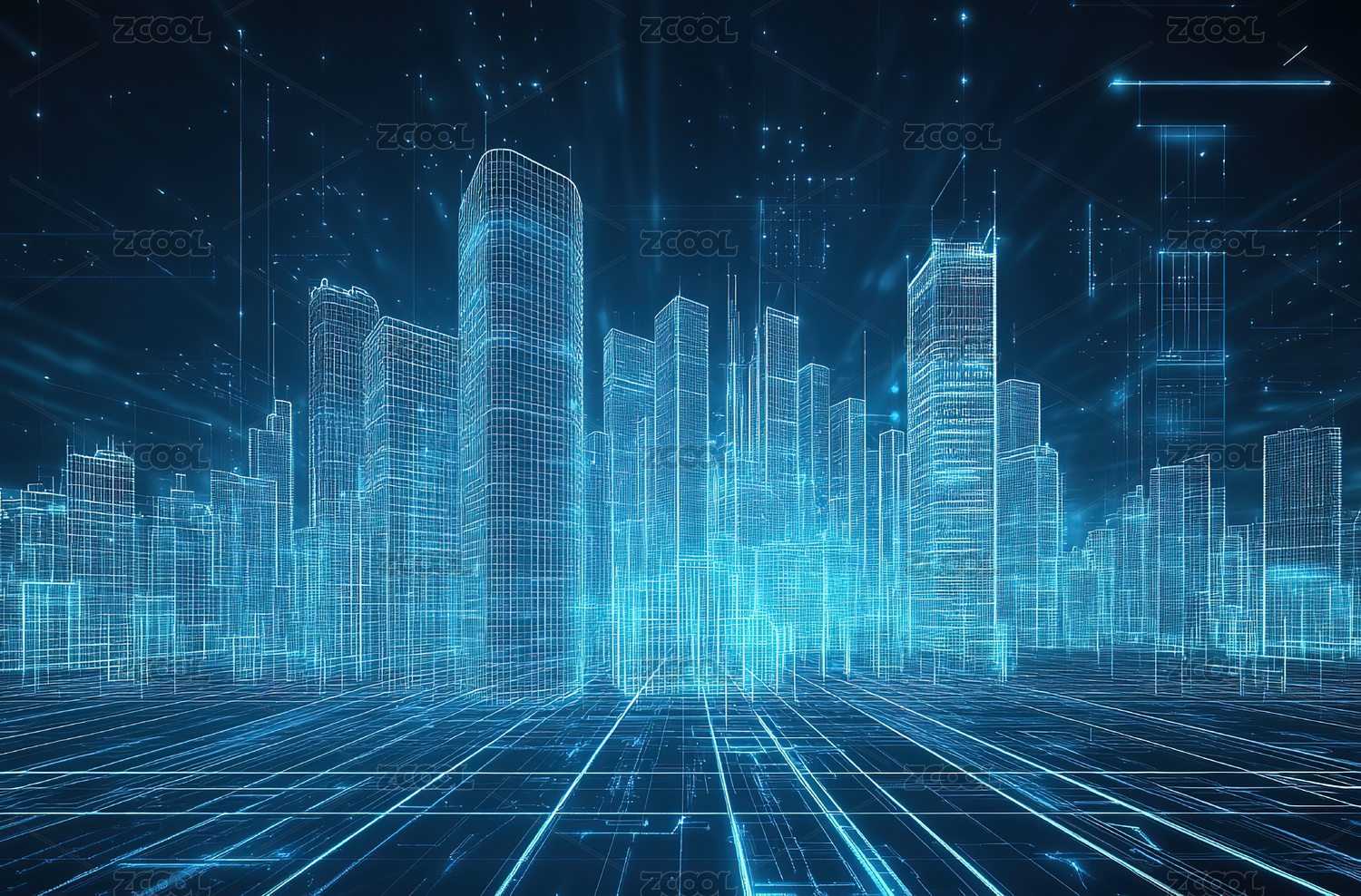 现代城市建筑蓝灯3D技术摩天大楼智能数据