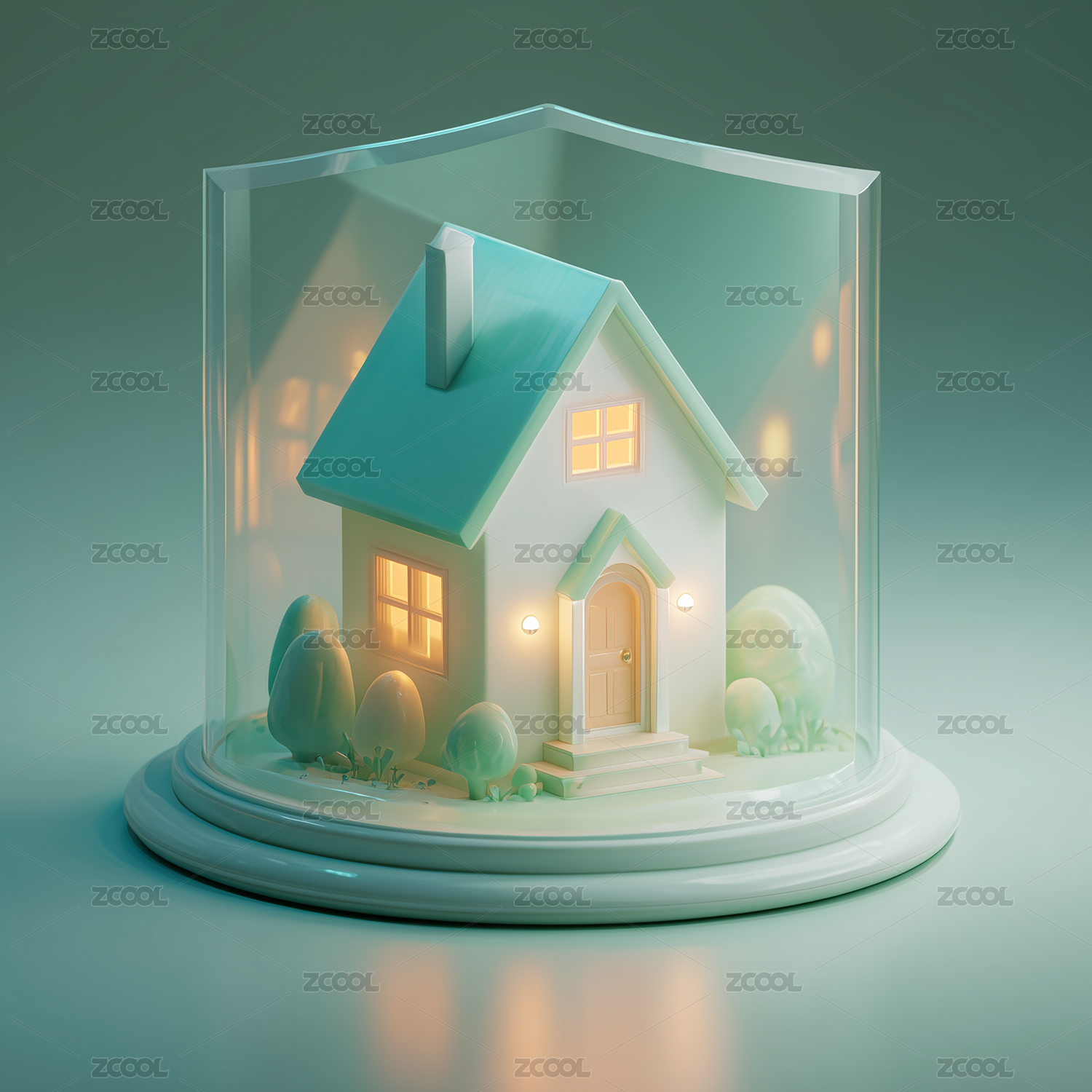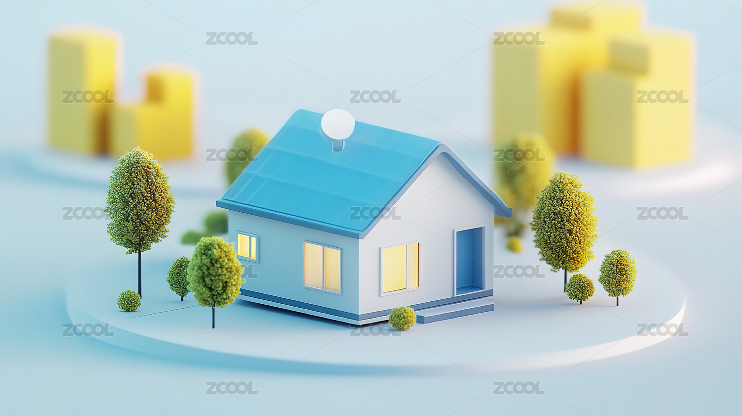 房屋,模型,蓝色,屋顶,黄色,墙壁,树木,围栏,灯光,夜晚