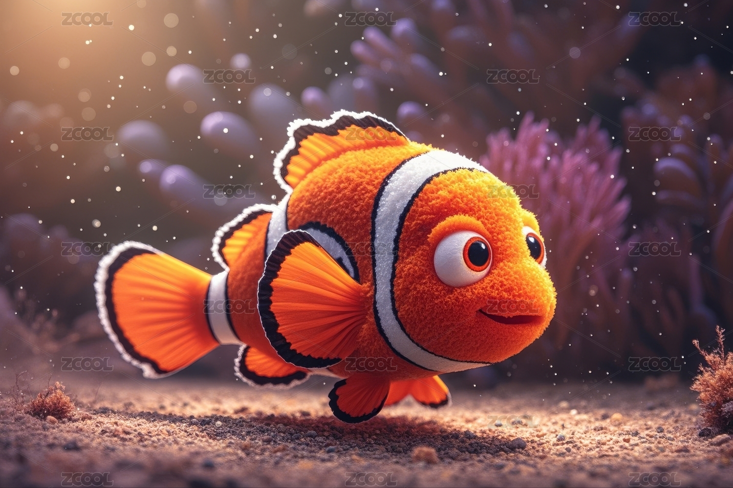 夜幕下珊瑚丛中可爱的卡通小丑鱼