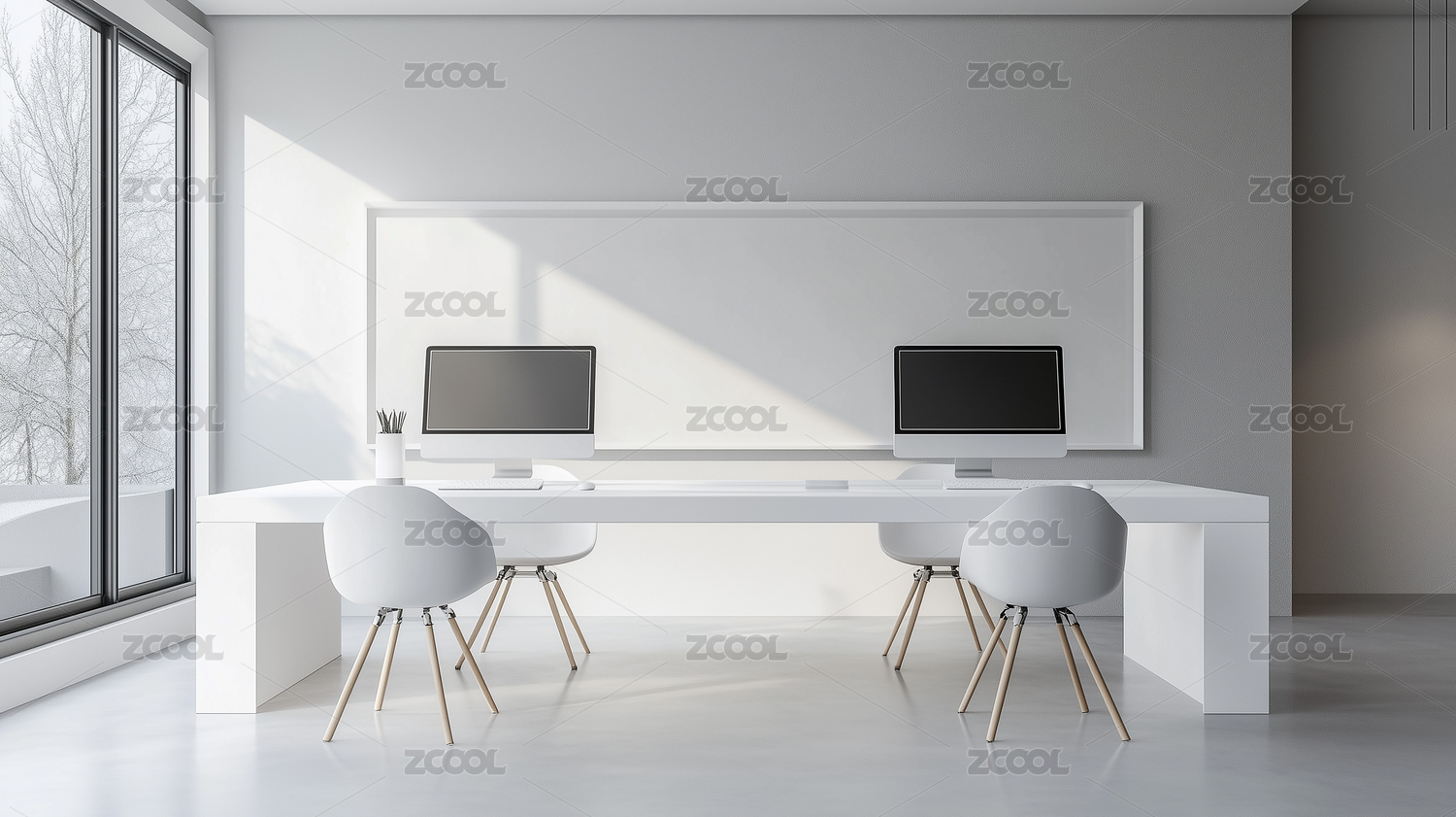 办公室,现代,桌子,椅子,电脑,植物,白色,简洁,设计