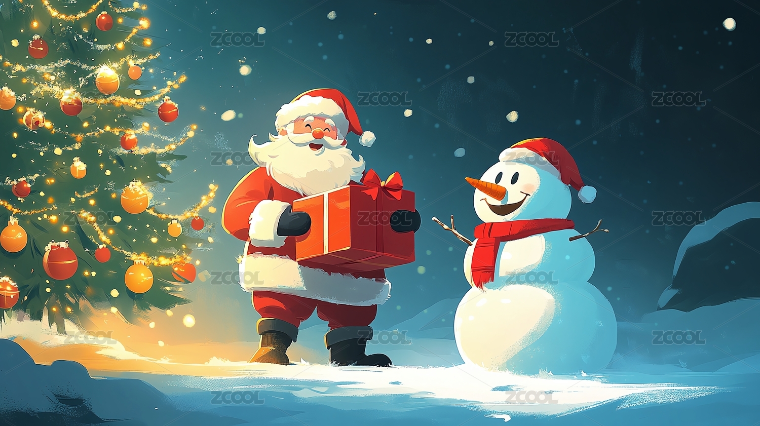 圣诞老人和雪人的晚上夜景插图
