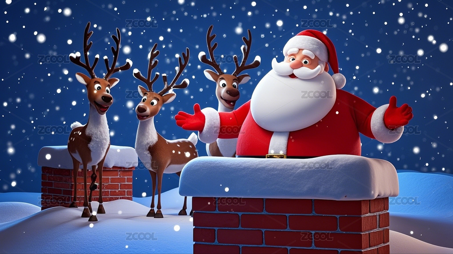 圣诞老人驯鹿雪夜场景