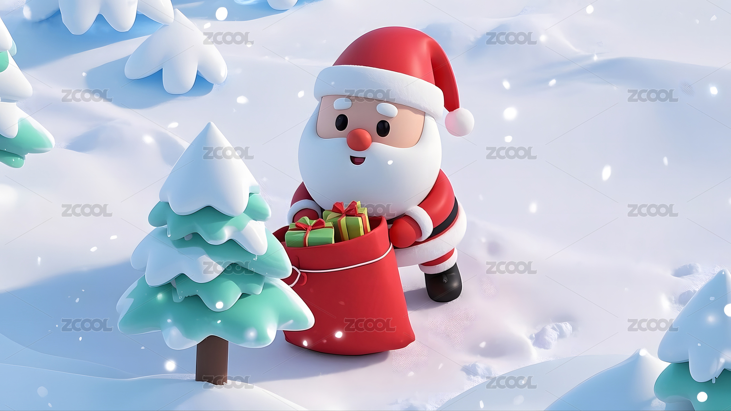 雪地上的圣诞老人和圣诞树