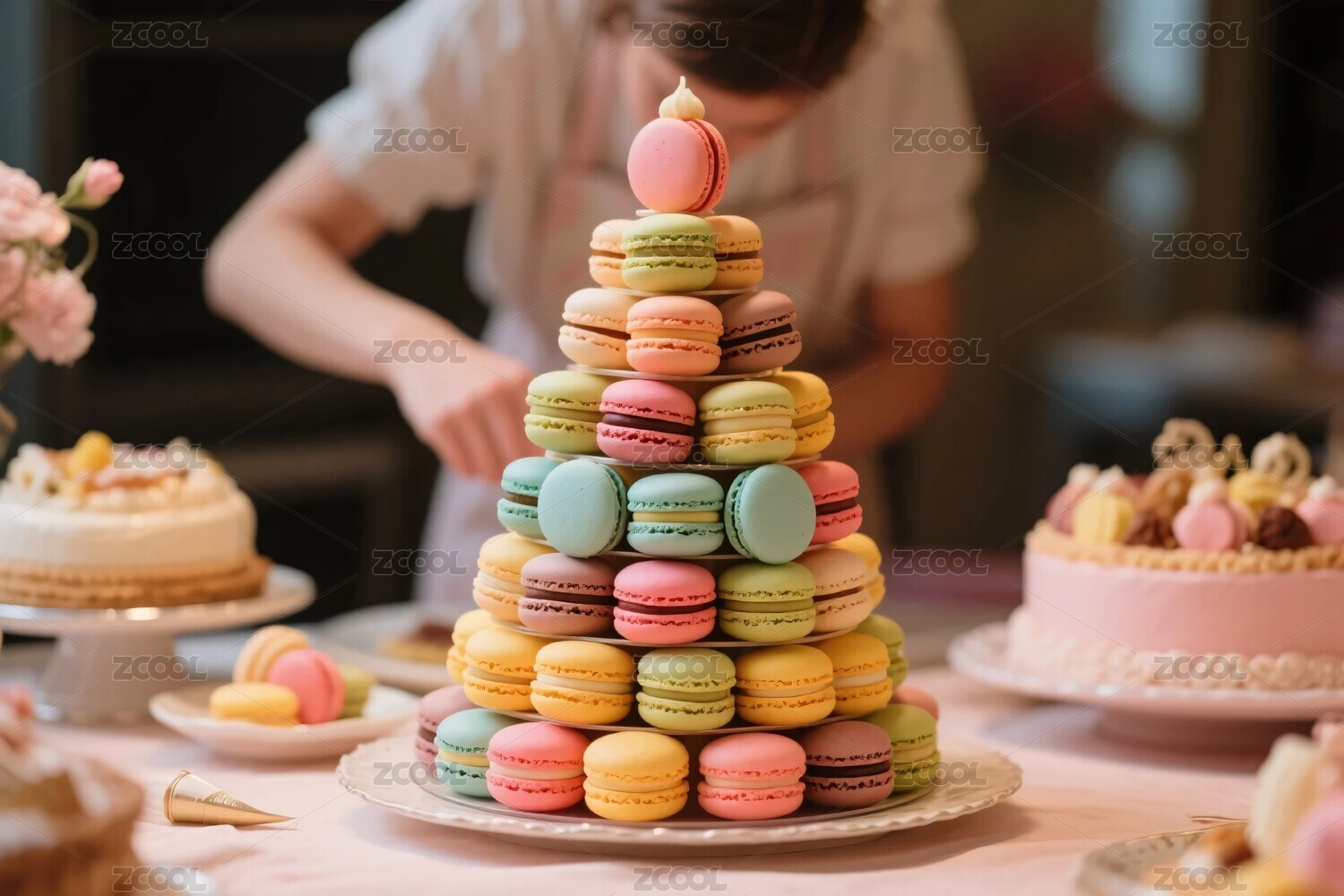 多彩马卡龙堆叠成塔的场景