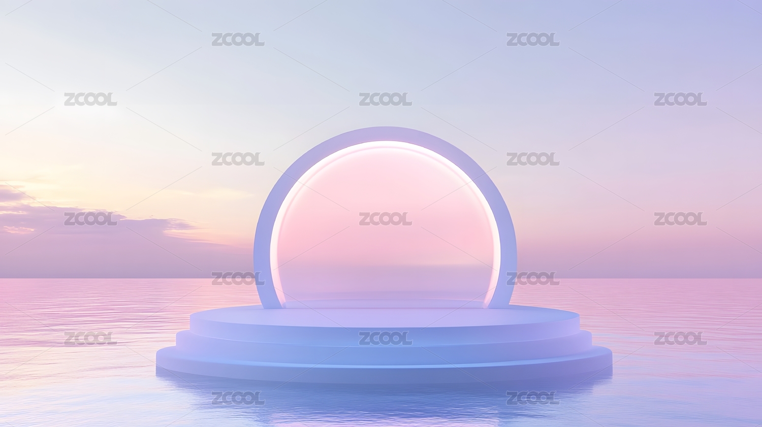 简约风格的展台有发光的霓虹圆环,背景为水