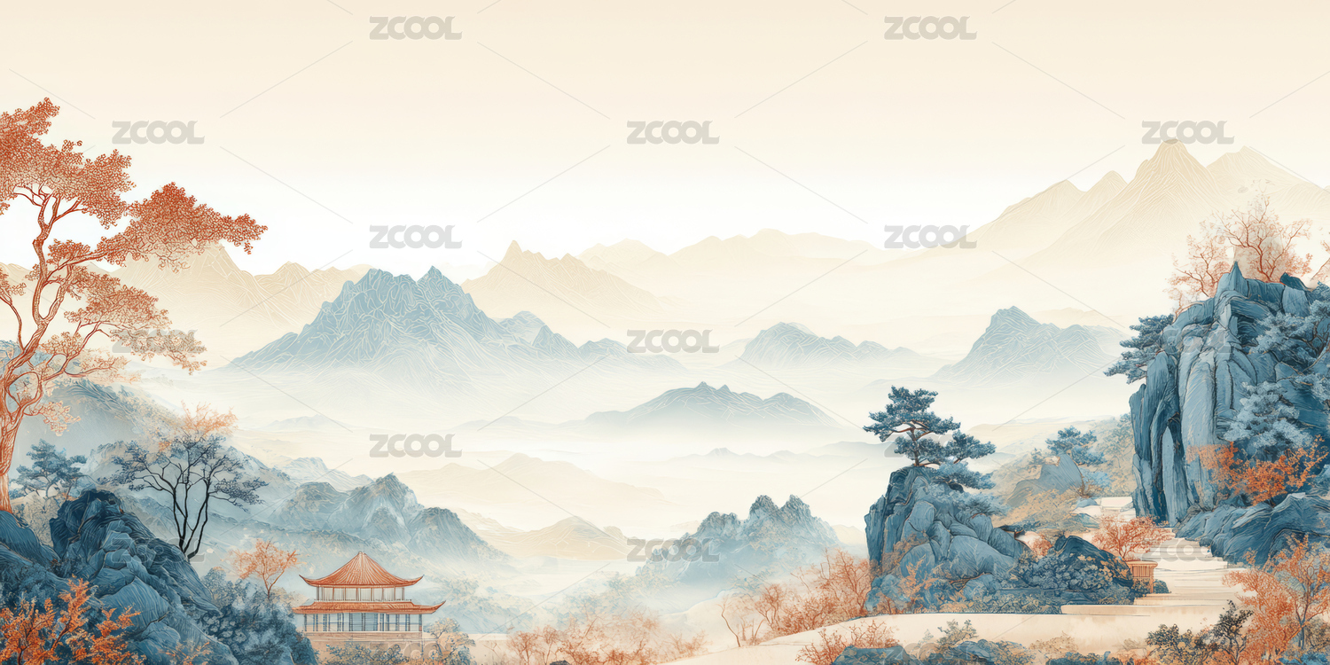 金色, 树木,山峦, 蓝色, 山峰, 云雾, 亭台, 楼阁, 朝阳