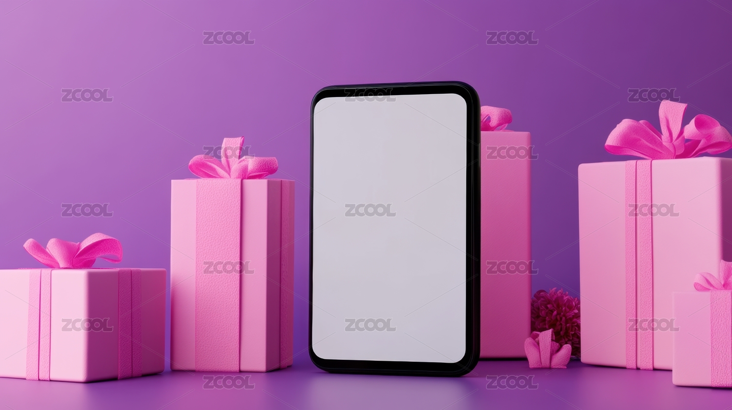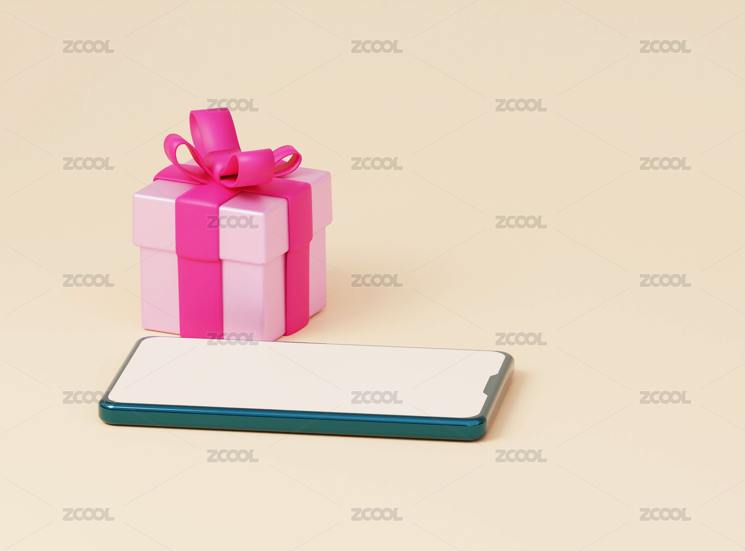 白色背景下桌子上的礼品盒和智能手机特写镜