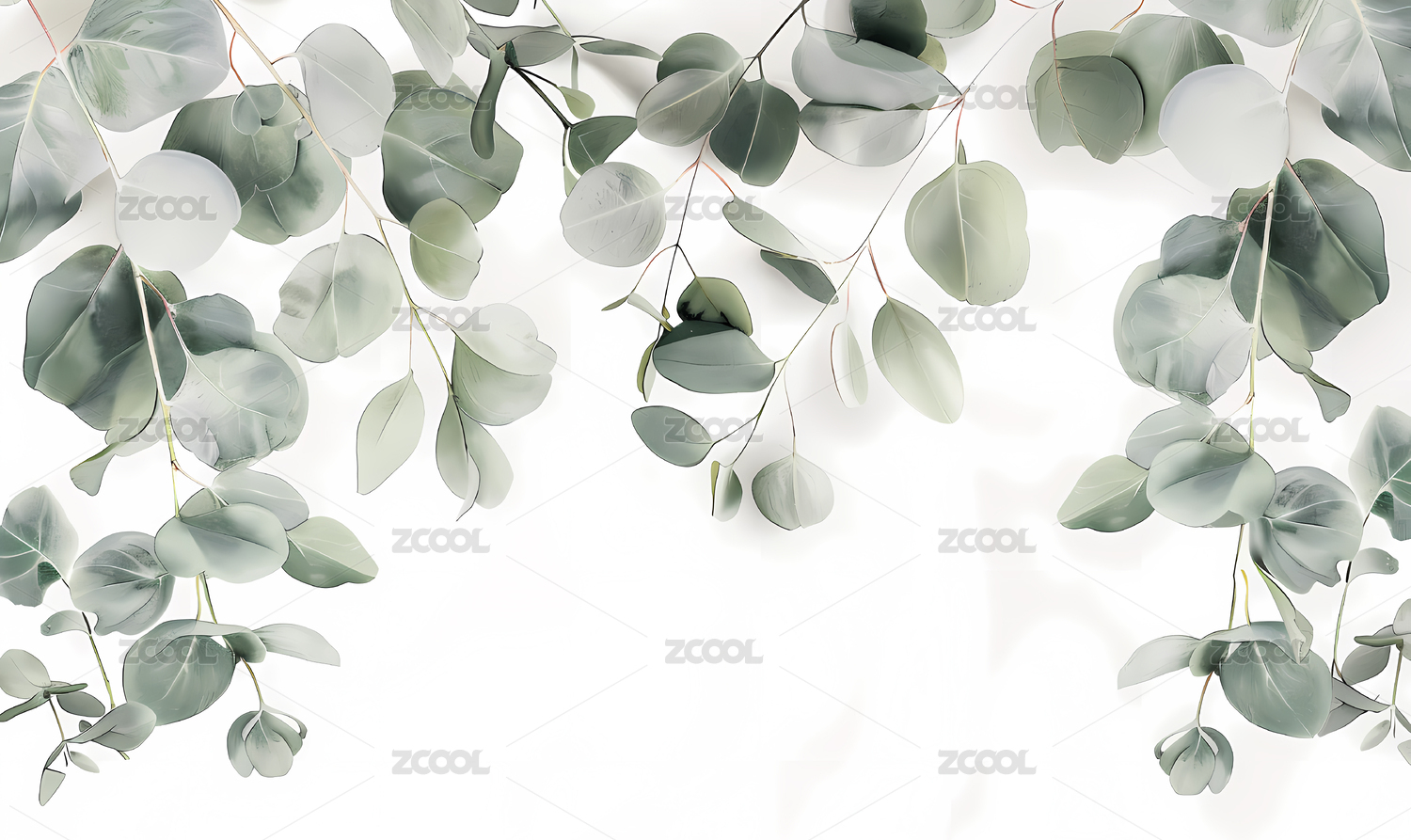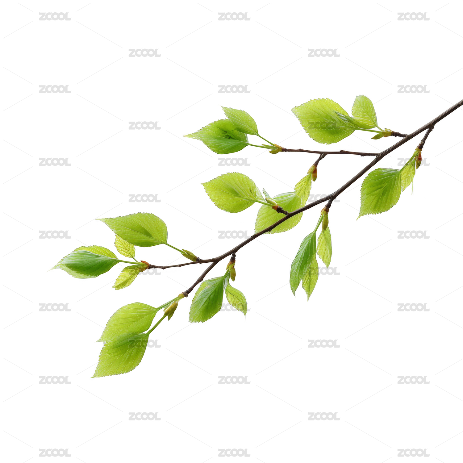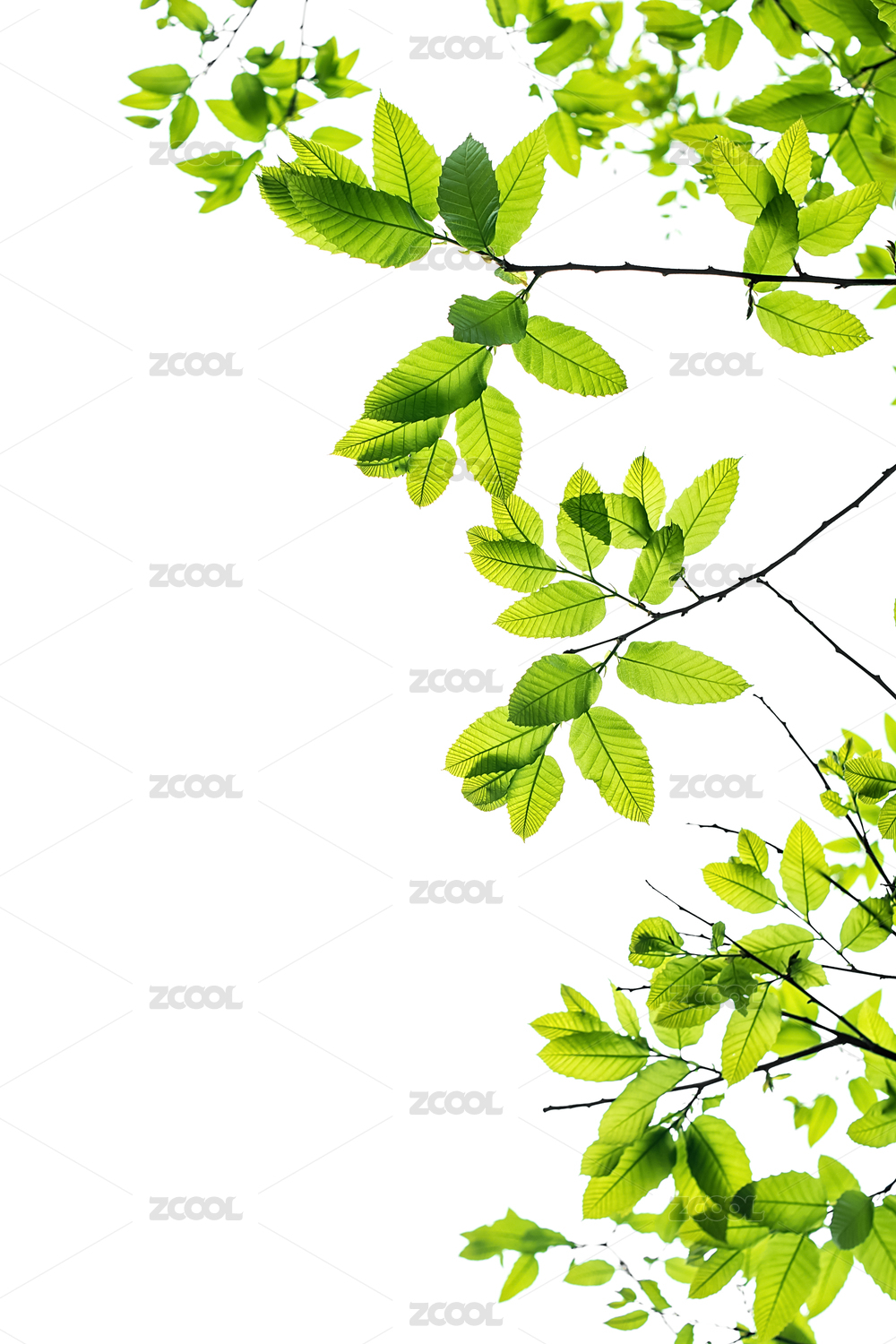 翠绿枝叶于白背景舒展