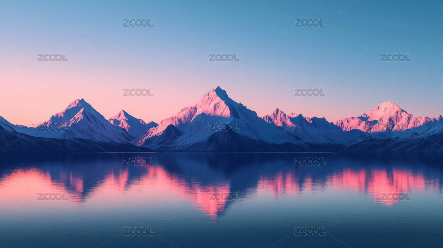 粉色雪山在湖面上的倒影