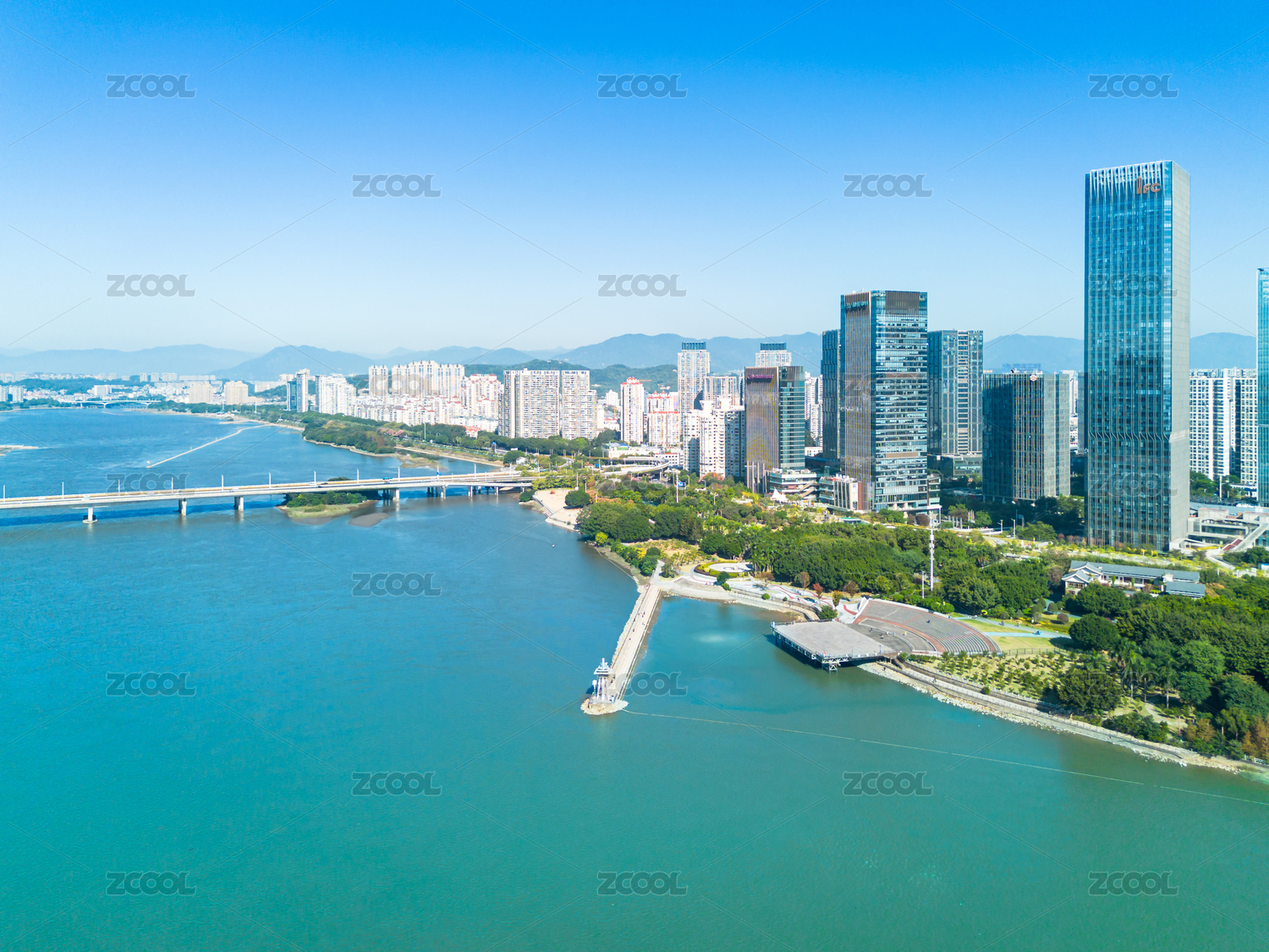 航拍白昼万里无云的惠州现代化城市桥梁景观