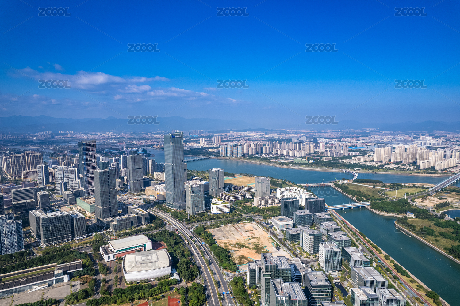 航拍白昼万里无云的惠州现代化城市景观