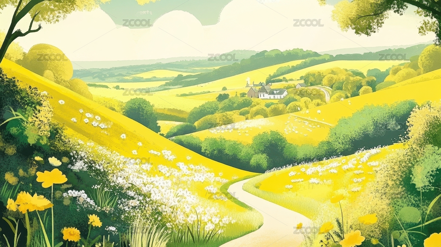 绿色乡村与漫山遍野的鲜花插画
