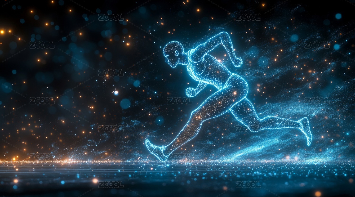 抽象运动员跑步的轮廓,深蓝色发光粒子背景