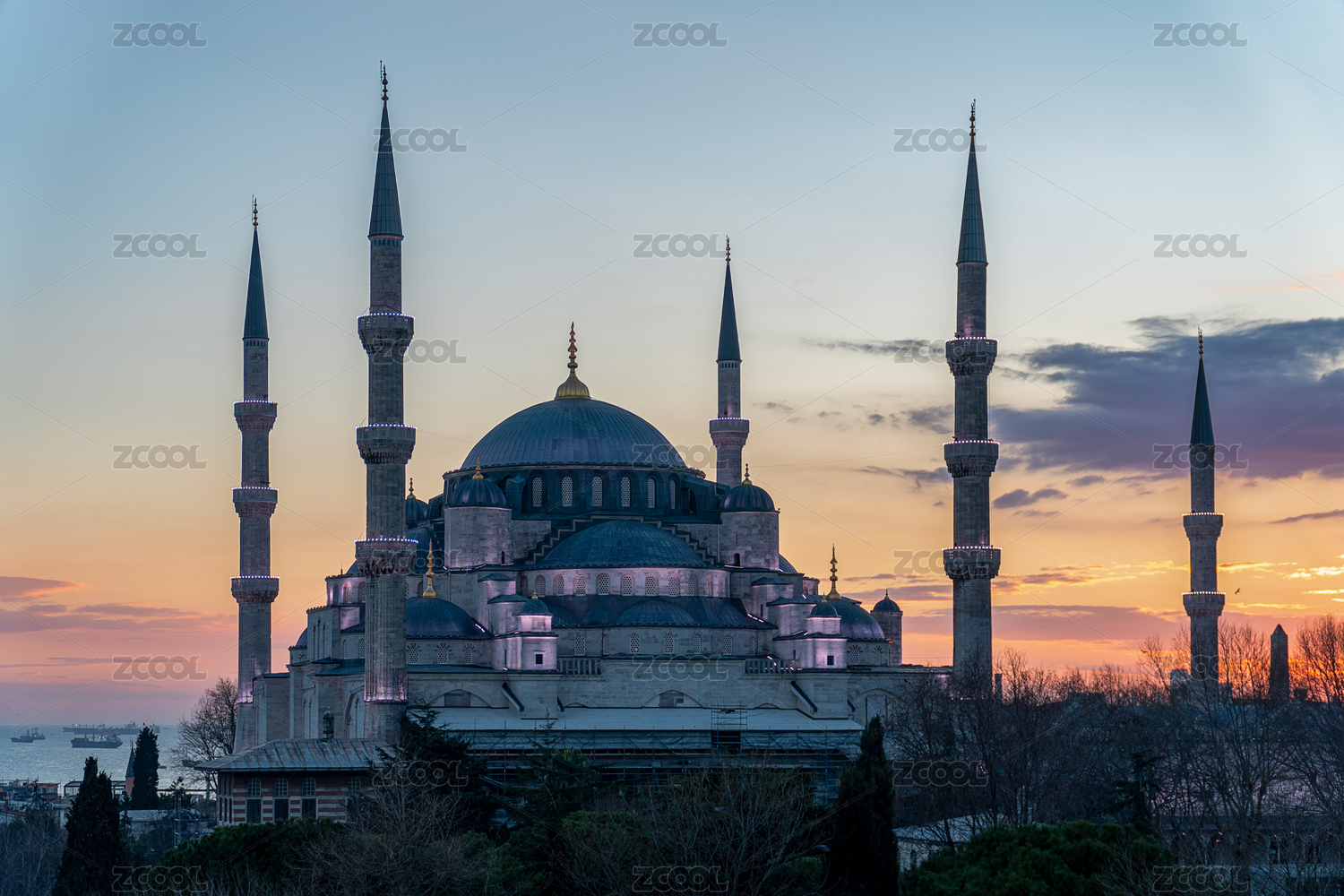 土耳其伊斯坦布尔蓝色清真寺夕阳