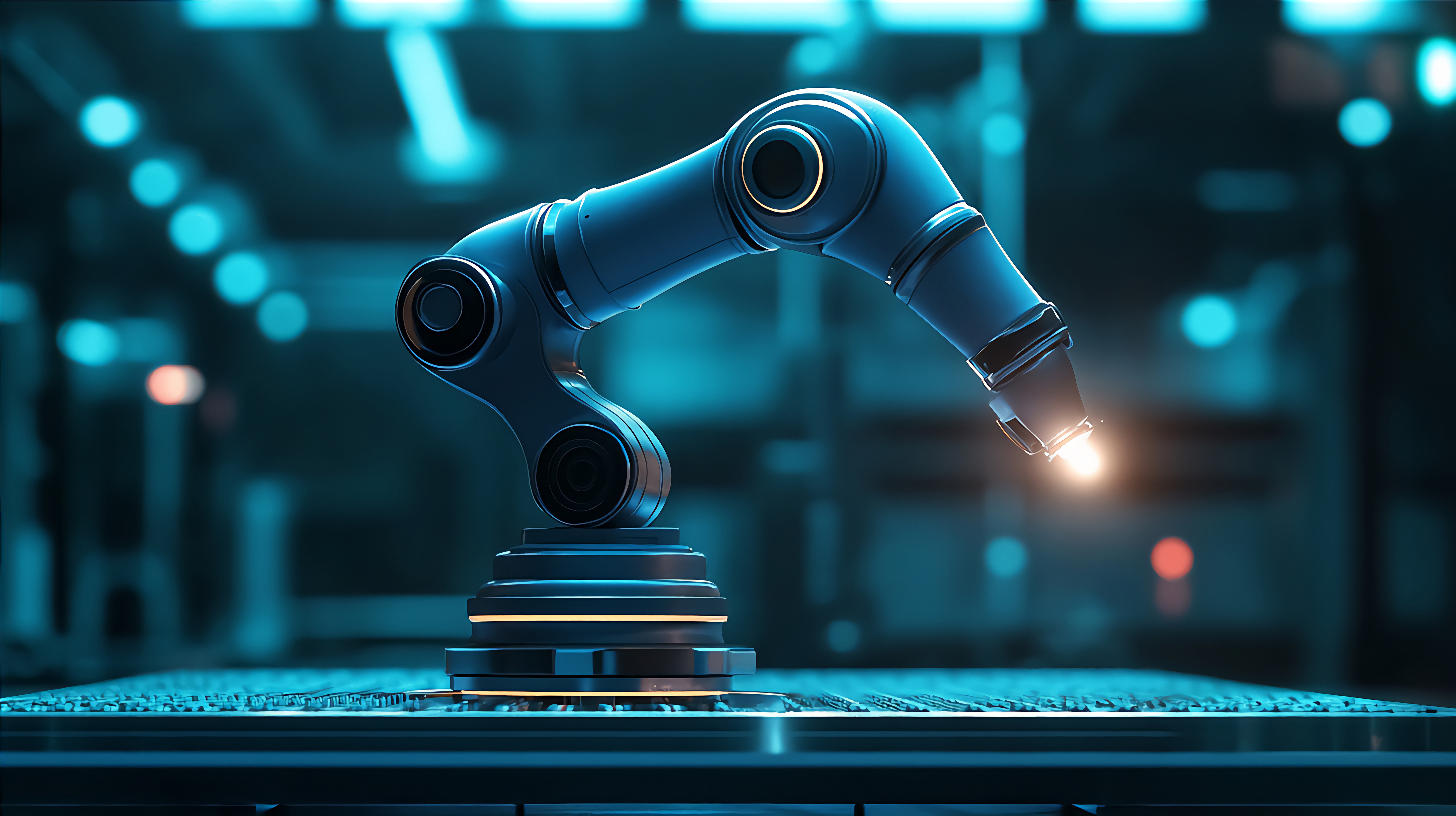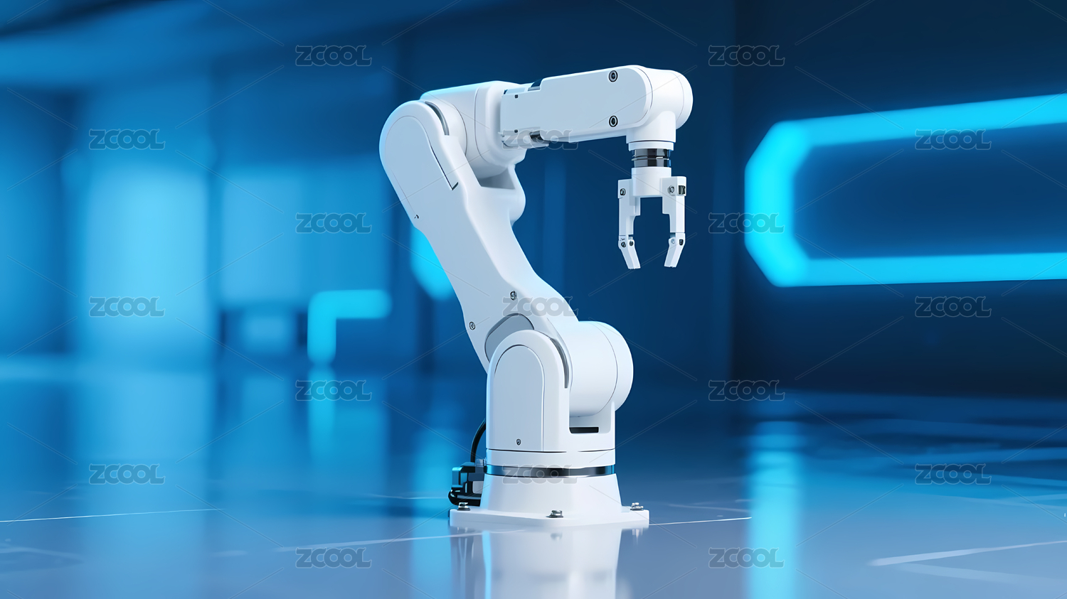 蓝色机械臂在发光的平台上