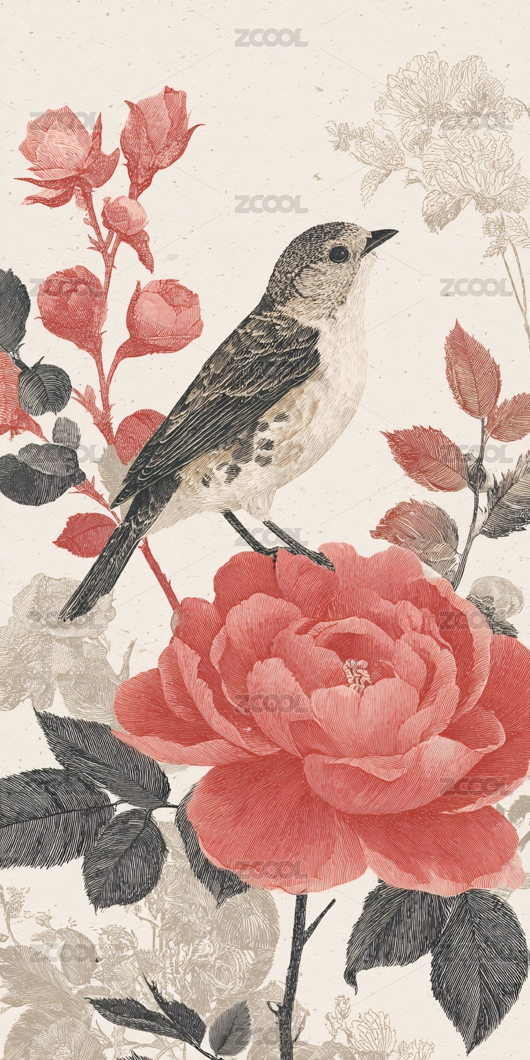 一只鸟站在树枝植物花卉上国画工笔画艺术