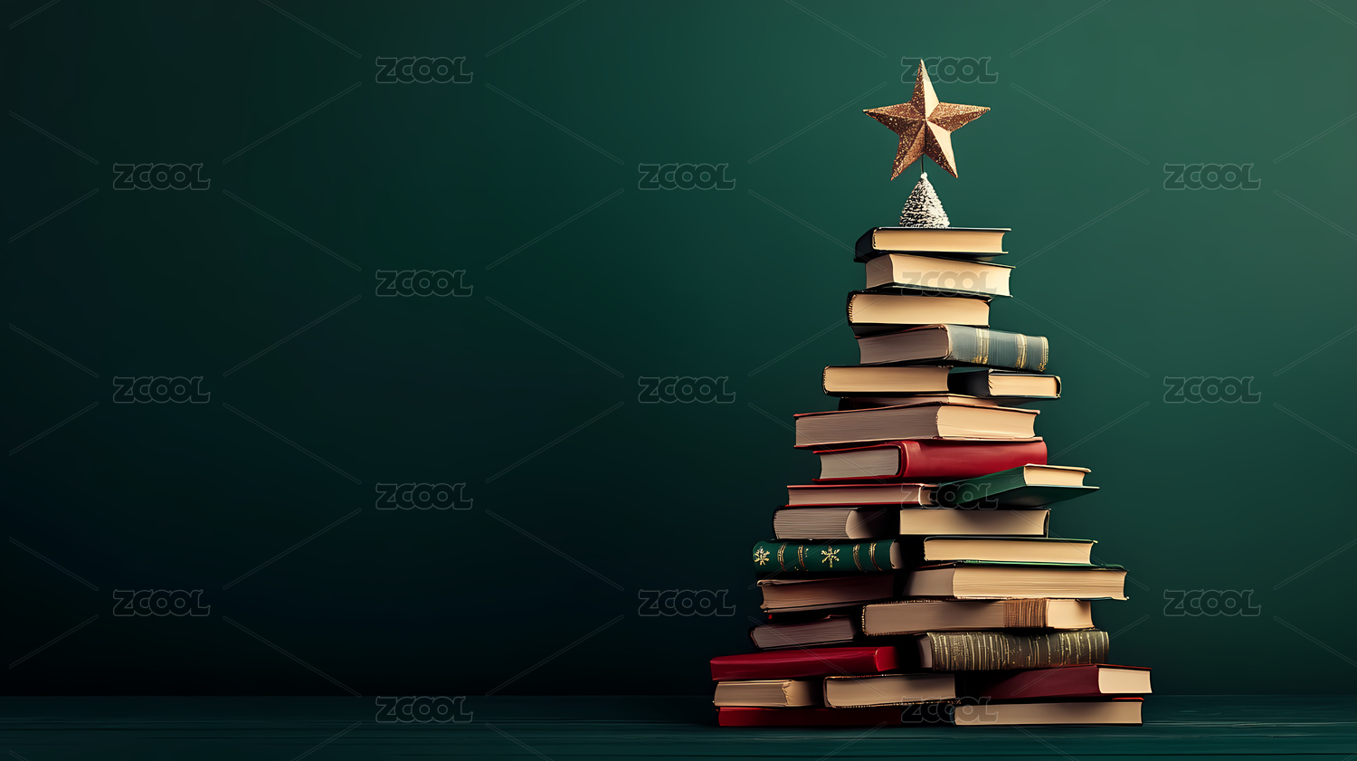 书本,堆叠,圣诞树,金色,星星,节日,绿色,装饰,创意,温馨