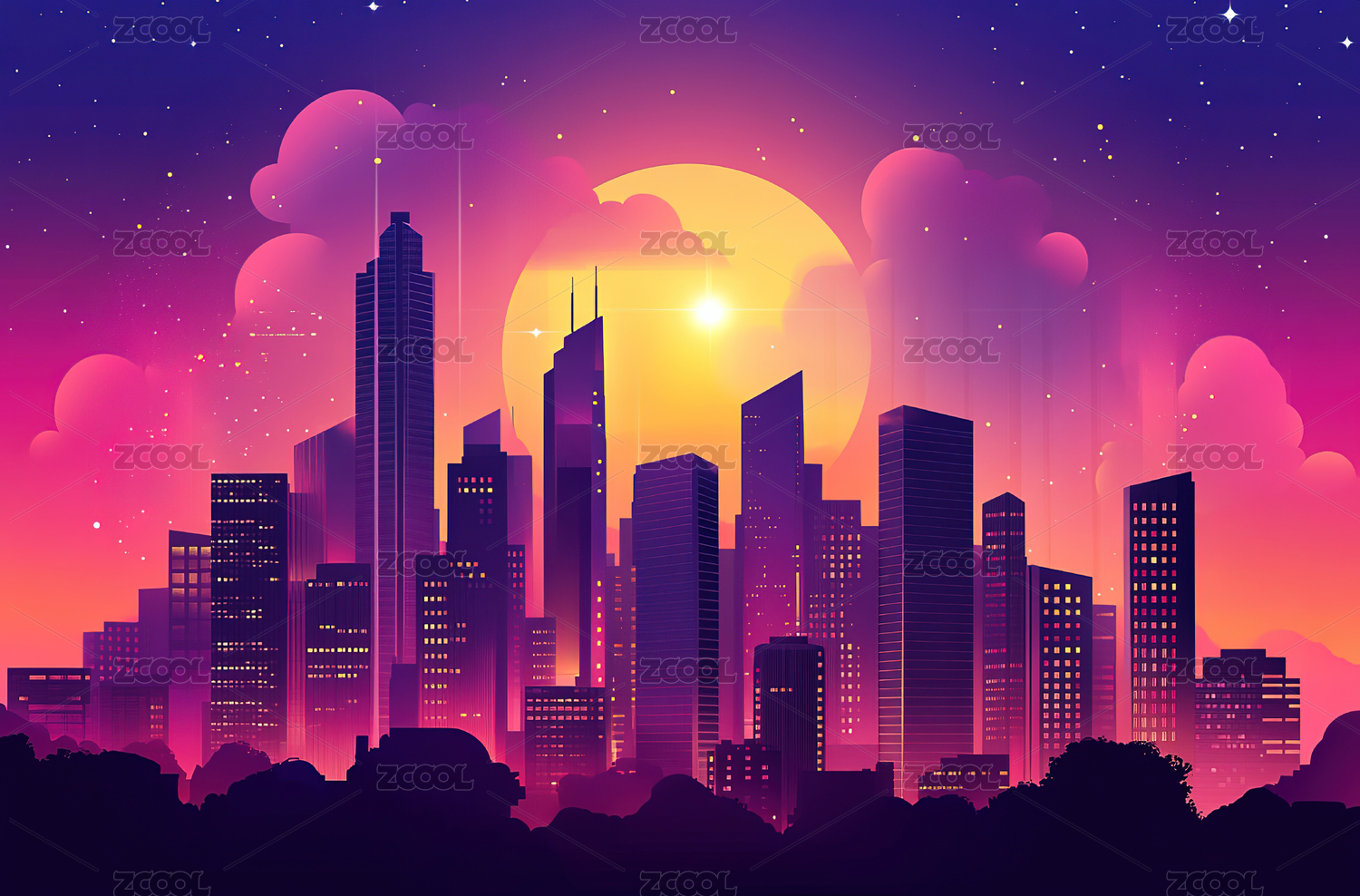 紫色夜空下的城市天际线