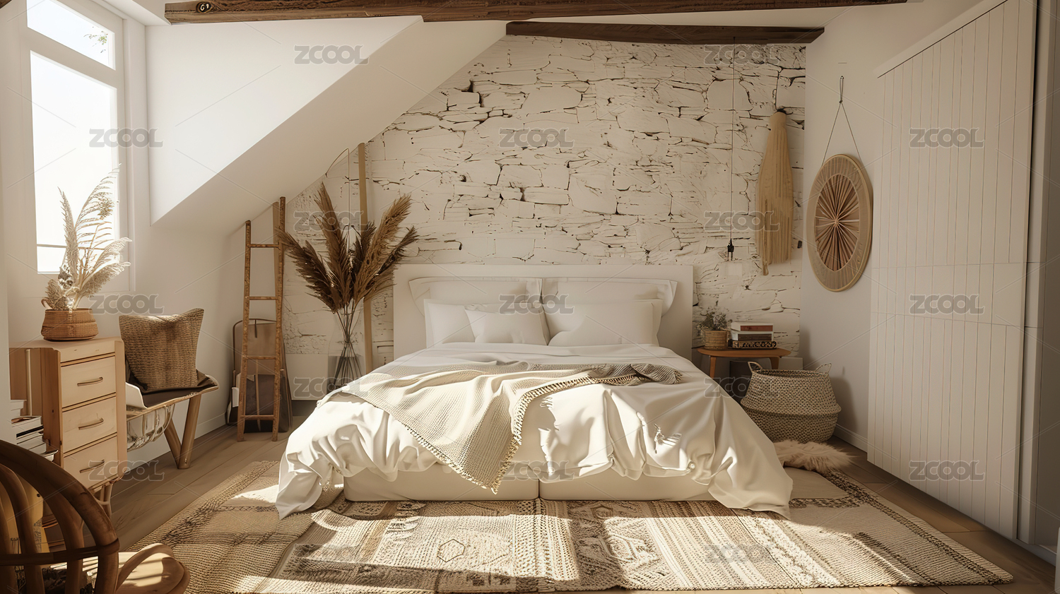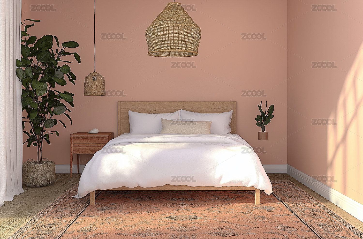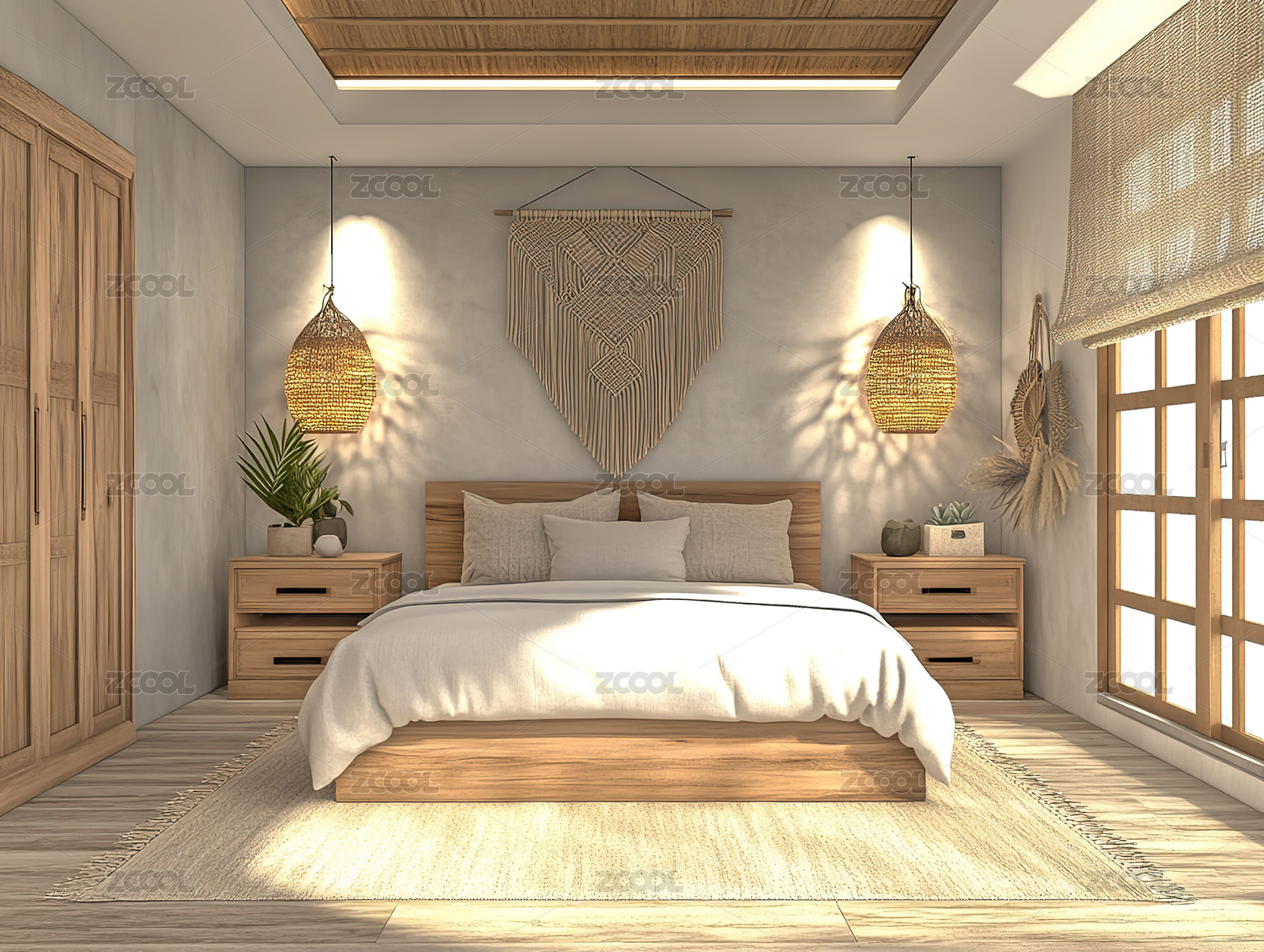 卧室,波西,米亚,植物,灯饰,床,装饰,自然光,窗户,挂毯