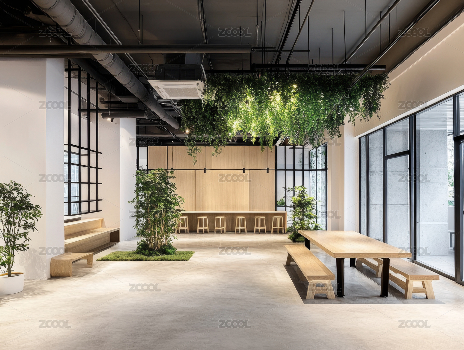 办公室,室内,设计,现代,书架,桌子,椅子,植物,窗户,咖啡吧