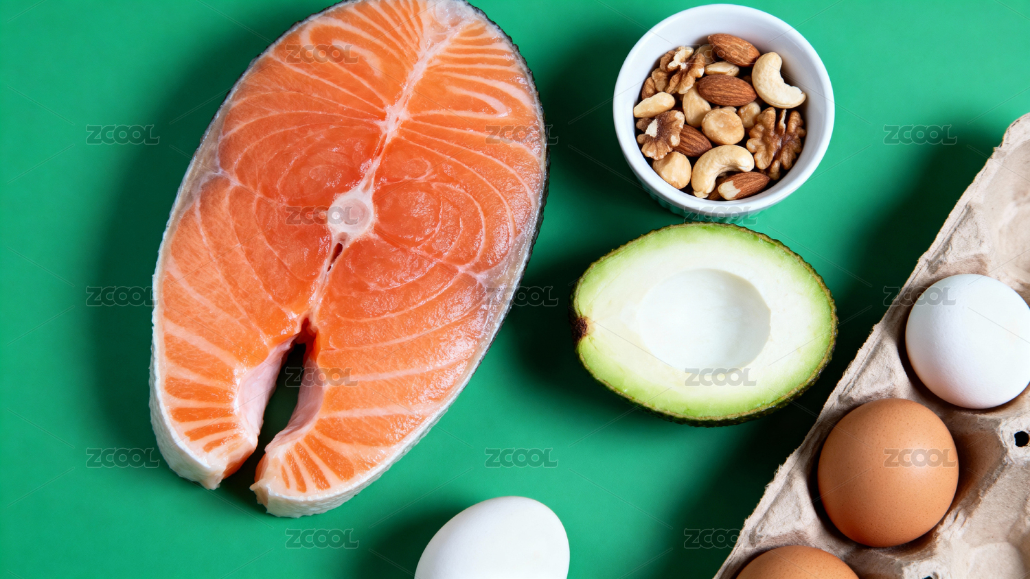 健康食材特写三文鱼牛油果坚果鸡蛋