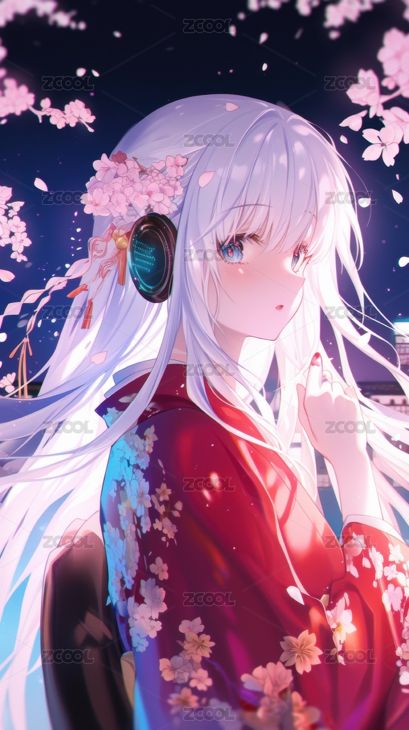 樱花树下穿和服的银发少女