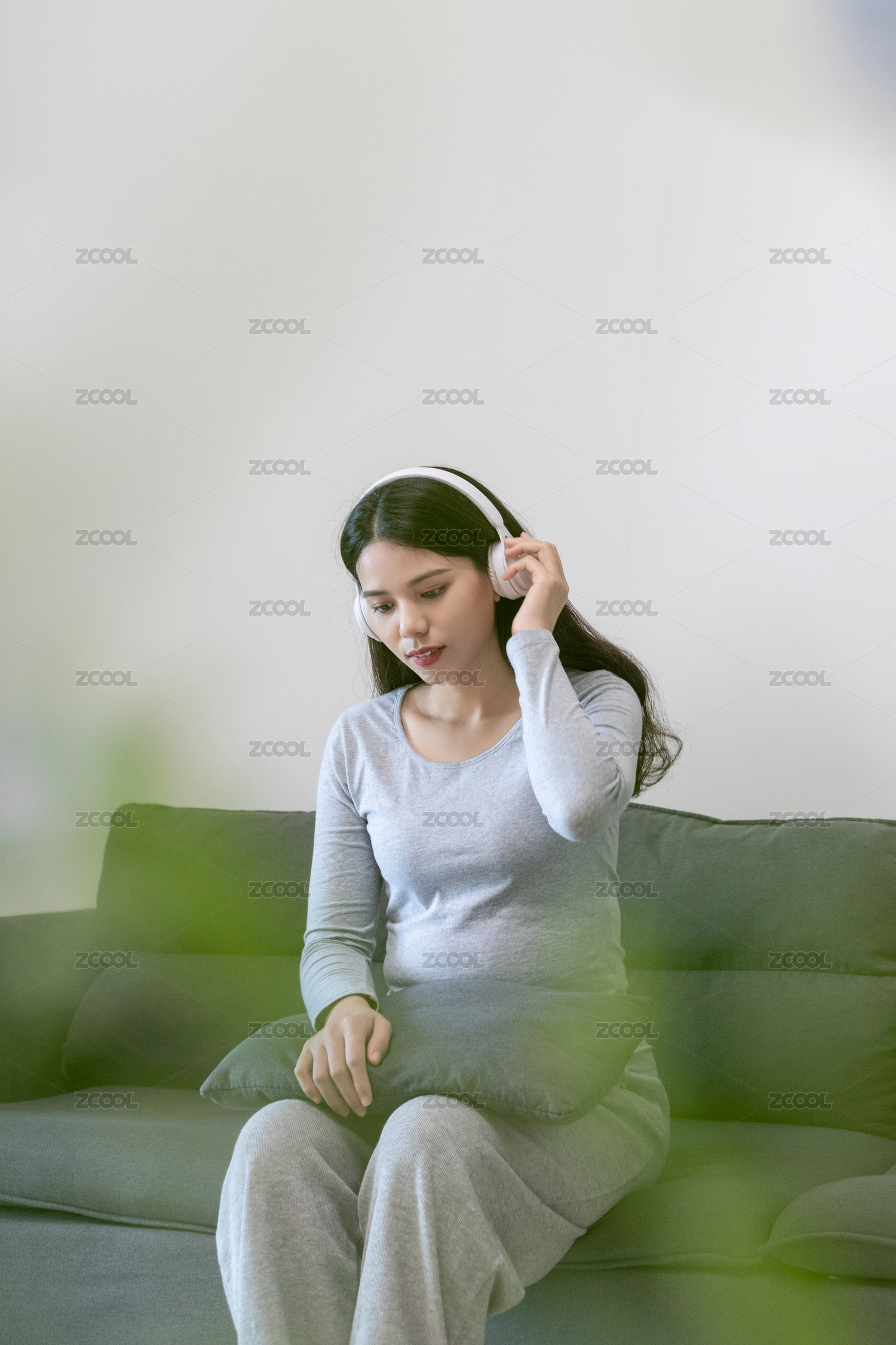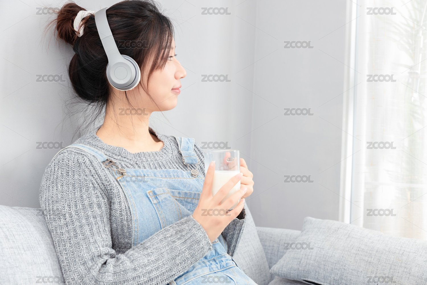 坐在沙发上带着耳机喝牛奶的亚洲女孩
