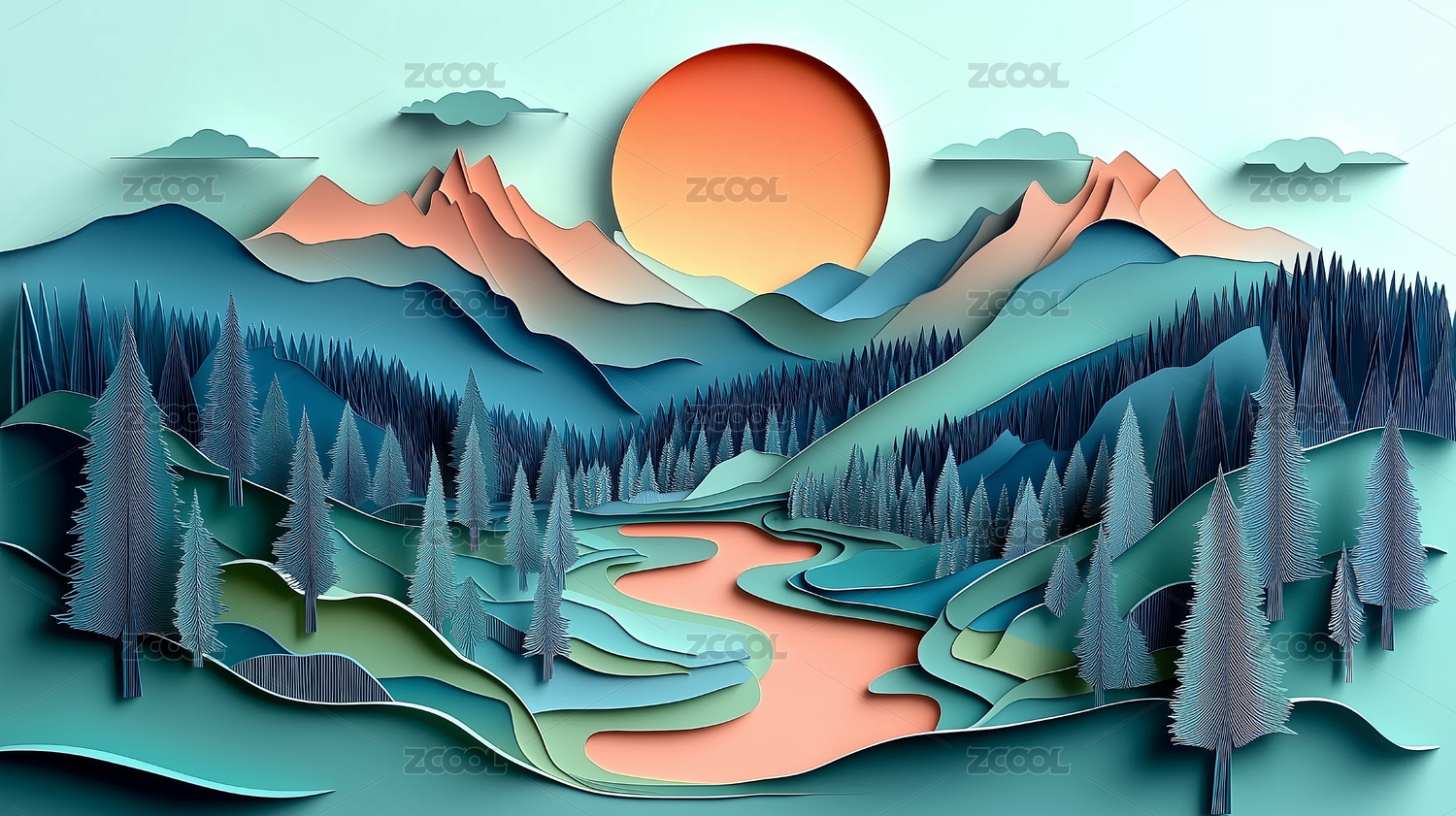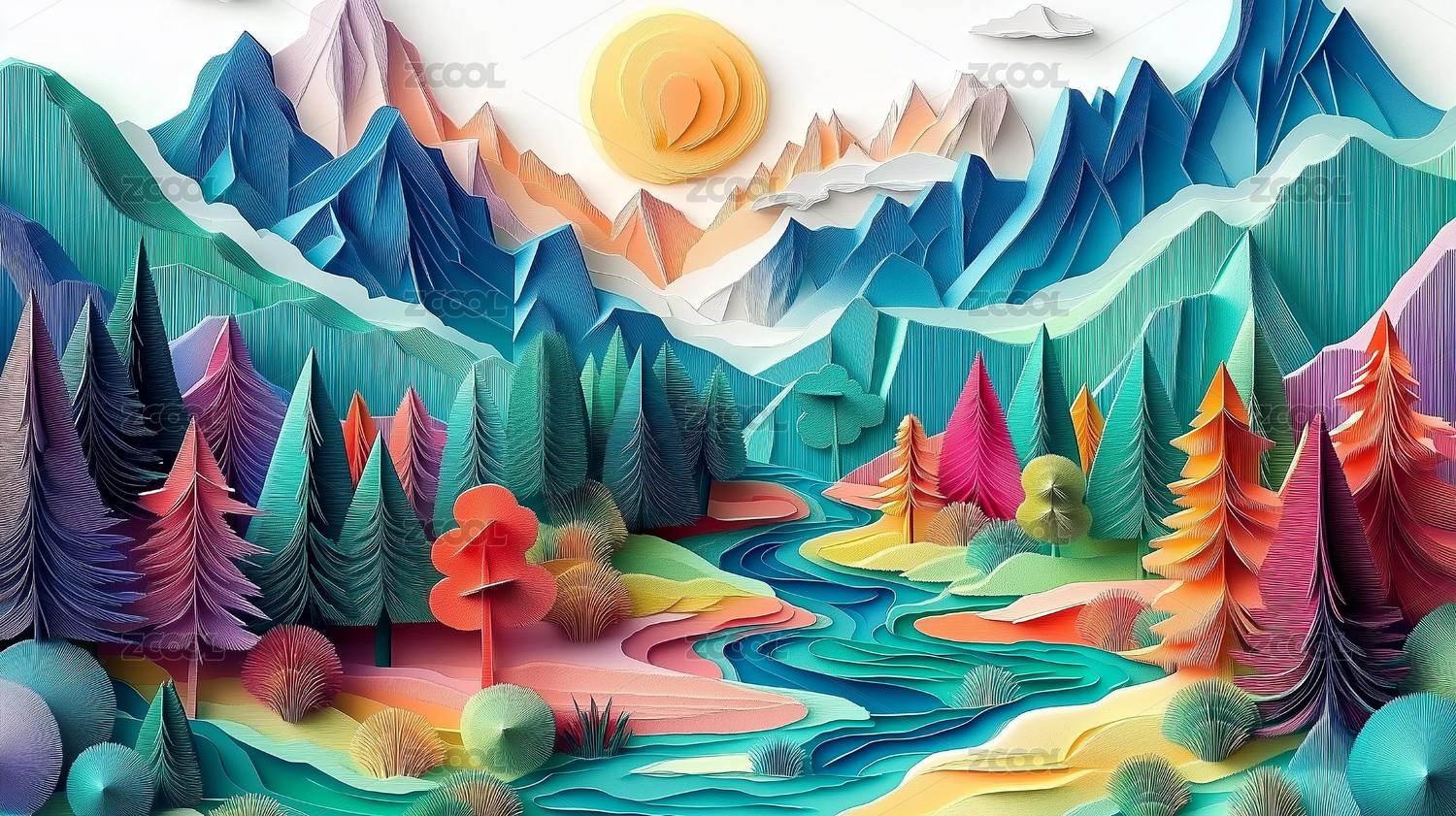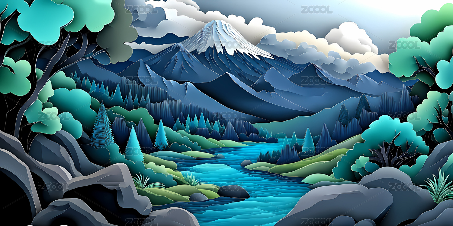 3D风格,树木,山峰,山,山坡,山顶,森林,自然,风景,景色