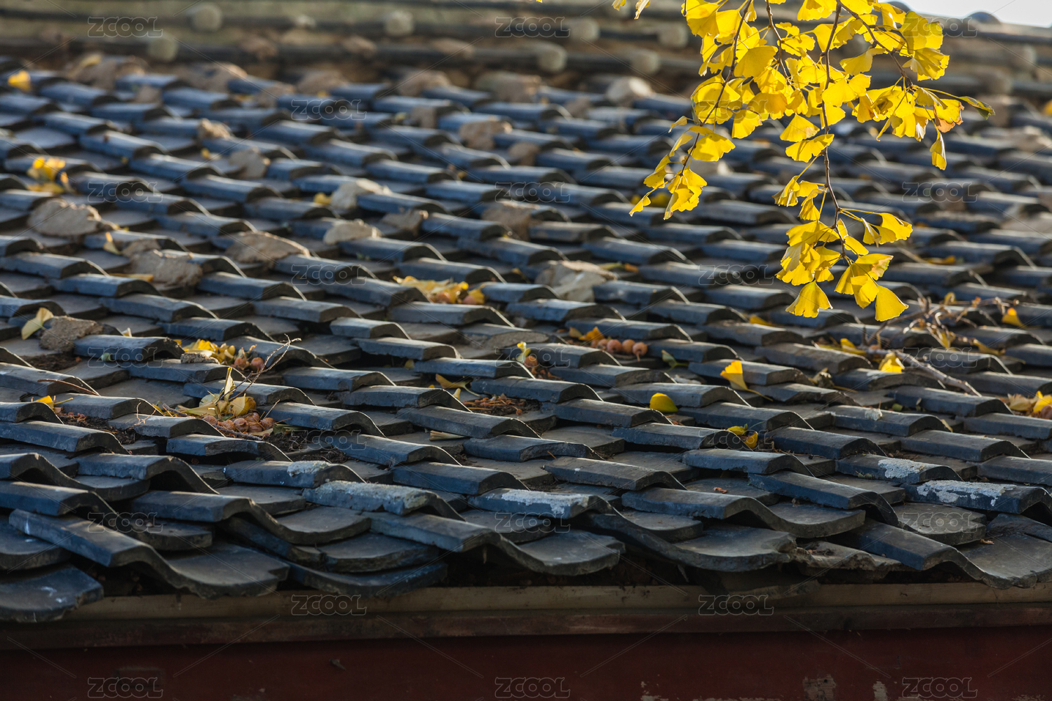 秋天季节瓦屋旁金黄色的银杏树叶子